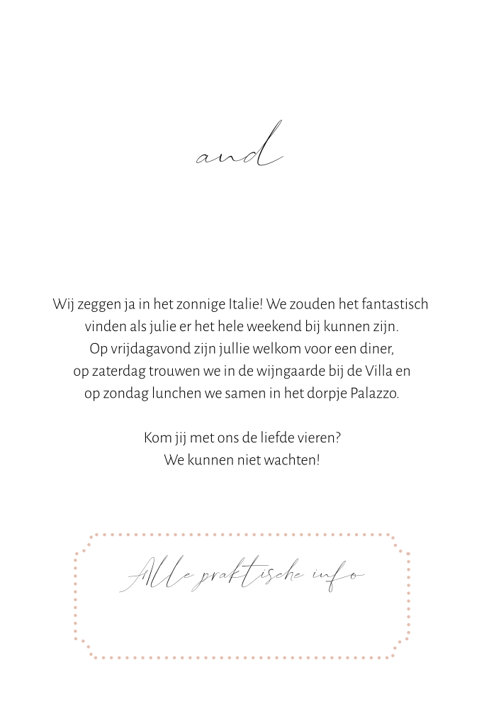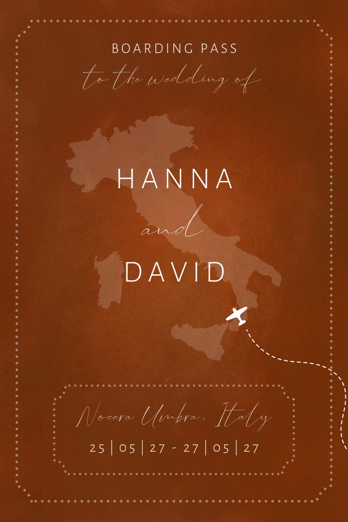 Originele trouwkaart in de vorm van een boarding pass met roségouden details en kaart van Italië. Perfect voor een bruiloft in het buitenland of voor echte reisliefhebbers! Het foliedruk vliegtuigje maakt dit ontwerp helemaal af. Pas deze trouwkaart zelf aan in onze editor.