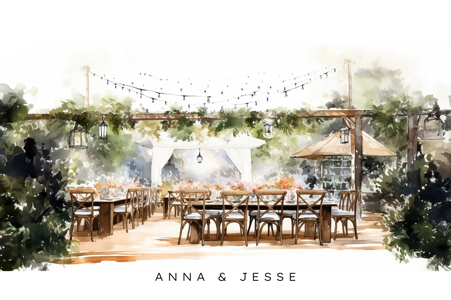 Waterverf trouwkaart met een prachtige tuin vol groene bomen en bladeren. Tafels en stoelen zijn liefdevol versierd met bloemen, klaar om vrienden en familie te ontvangen. Boven de dinertafel glinsteren lampjes als sterren aan de nachtelijke hemel. Pas de kaart naar wens aan met de editor.