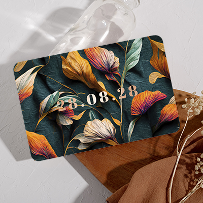 Trouwkaart met koperfolie datum en roestbruine bloemen