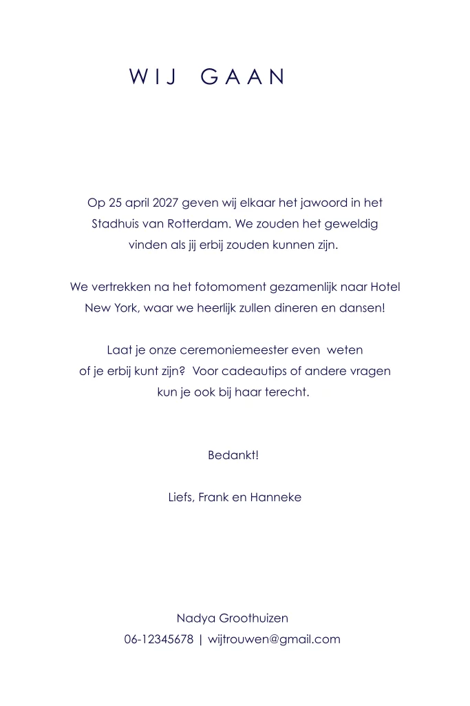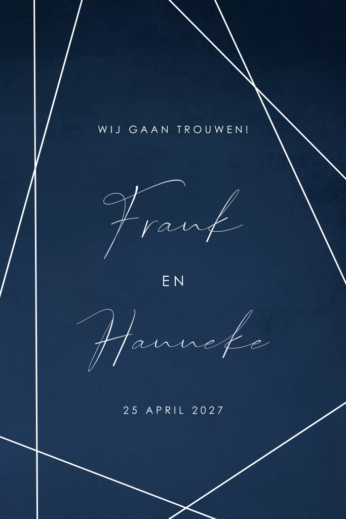 Donkerblauwe trouwkaart met roségouden lijnen. Mooi ontwerp met sierlijke typografie en roségoudfolie. De namen, kopjes en lijnen zijn in roségoudfolie en spatten van het papier af, zeker in combinatie met de diepblauwe waterverf achtergrond komt de rosegouden kleur mooi tot recht. Pas zelf de teksten naar wens aan. Wil je een andere achtergrond? Deze kun je zelf aanpassen, lukt dit niet, bel ons dan even, we helpen je graag.