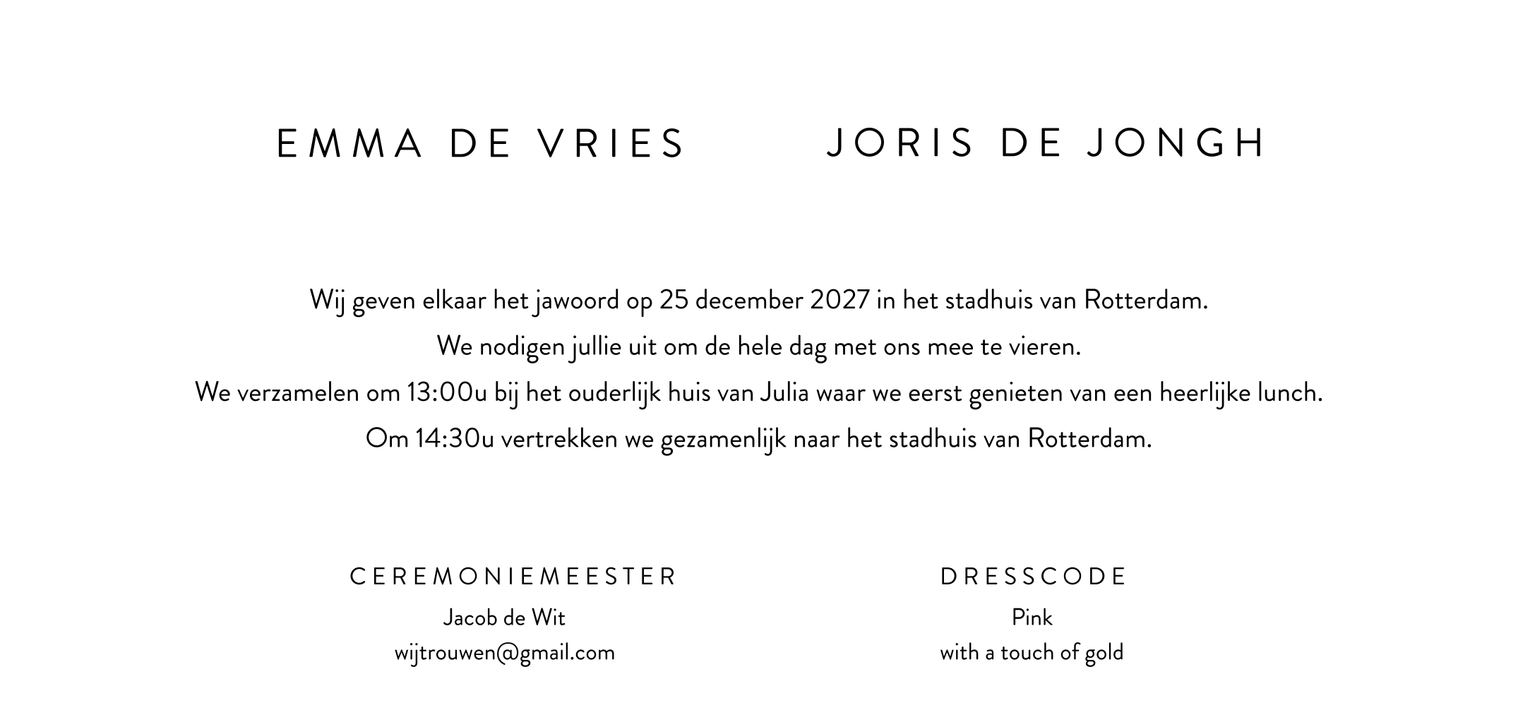Hou jij van strak en stoer? Dan is deze hippe trouwkaart met grafische uitstraling dé kaart voor jouw bruiloft. De datum staat met grote cijfers met echt goudfolie voorop. Ook is er ruimte voor een mooie foto. In de kaart overheerst de grijsgroene kleur en staat er met hetzelfde lettertype 'wij gaan trouwen'.