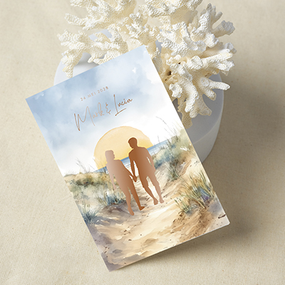 Op zoek naar de perfecte trouwkaart voor jullie zomerse bruiloft? Ontdek onze prachtige trouwkaart met een waterverf strand illustratie. Deze unieke kaart toont twee elegante silhouetten van jullie, uitgevoerd in koperfolie, die hand in hand door het zand en de duinen wandelen richting de zee, terwijl de zon langzaam ondergaat. Het romantische tafereel straalt warmte, liefde en de magie van een zomeravond uit.