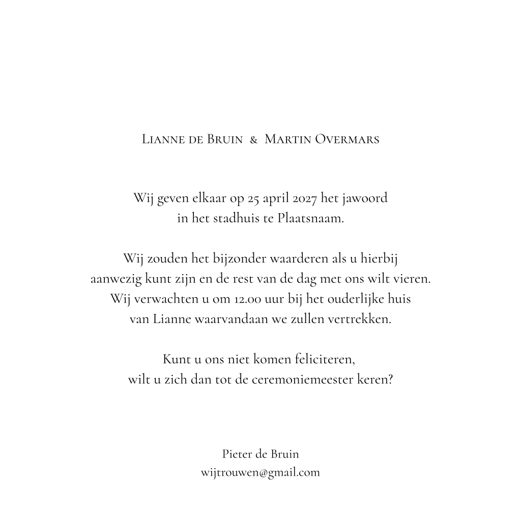 Op zoek naar een minimalistische trouwkaart? Deze witte trouwkaart valt op doordat de namen in goudfolie van de kaart af spatten. Een eenvoudige, maar chique trouwkaart met goudfolie. Aan de binnenzijde staat een blauwe tekst met daaromheen goudkleurige spetters. In de kaart is ruimte voor het dagprogramma. Liever een strak of stoer lettertype? Pas dit ontwerp gemakkelijk aan in onze handige ontwerptool.