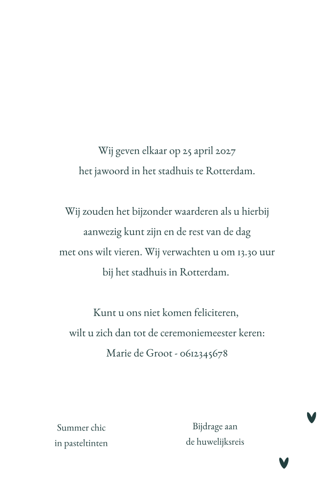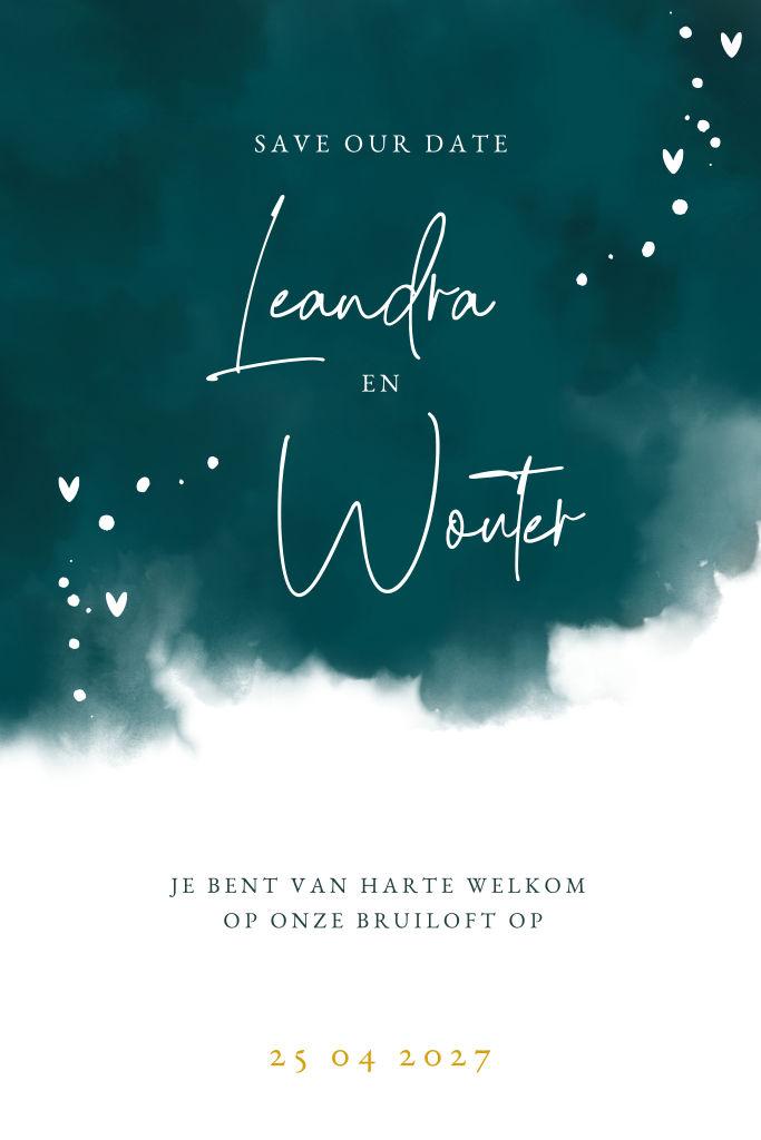 Zeegroene trouwkaart met goudfolie typografie, hartjes en spetters. Zeegroen is de kleur van het moment. Combineer dit met gouden accenten en je hebt een trouwkaart volgens de laatste trends. Deze chique kaart heeft zeegroene waterverf als achtergrond. Jullie namen met staand met chique typografie in goudfolie gedrukt. De spetters en hartjes zorgen voor een speels effect. In de kaart is ruimte voor het programma en een persoonlijk tekstje. Deze trouwkaart is ook mooi met zilverfolie. In de ontwerptool kun je dit gemakkelijk aanpassen.