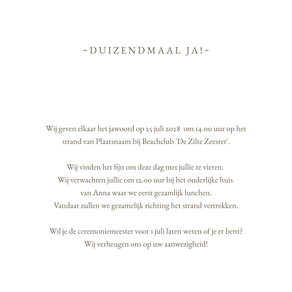 Hebben jullie trouwplannen om komende zomer te trouwen en denken jullie aan een mooie dag op het strand? Wat is er dan mooier dan een trouwkaart te kiezen in dit strand thema. Deze witte trouwkaart met hart opgebouwd uit gouden schelpen is perfect. Met deze trouwkaart met strandthema nodig je je bruiloftsgasten in stijl uit. Vraag een drukproef aan om de kaart in het echt te zien.