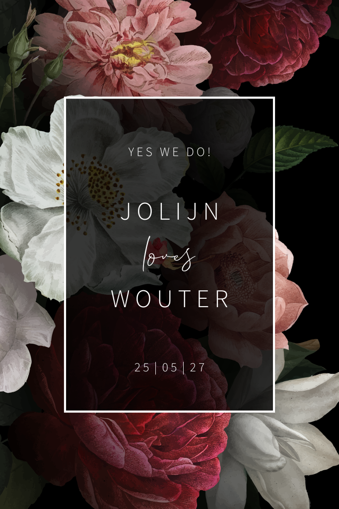 Treden jullie binnenkort in het huwelijk? Nodig je gasten voor jullie trouwdag uit met deze stijlvolle trouwkaart met grote bloemen op een zwarte achtergrond. Het kader en de namen van het bruidspaar worden gedrukt in echt roségoudfolie en spat van het papier af. Je kunt de kaart eenvoudig aanpassen in de designtool.