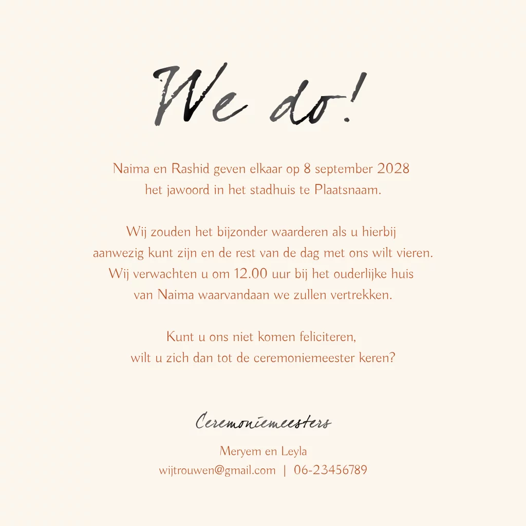 Een stijlvolle trouwuitnodiging in zachte, beige tint met roestbruine lijnen en hoogglans zwarte details. Liever een andere kleur hoogglans of foliedruk? Pas dit gemakkelijk aan in onze ontwerptool. Aan de binnenzijde is genoeg ruimte voor alle info over jullie trouwdag. Pas deze kaart naar eigen wens aan en bestel een proefdruk.