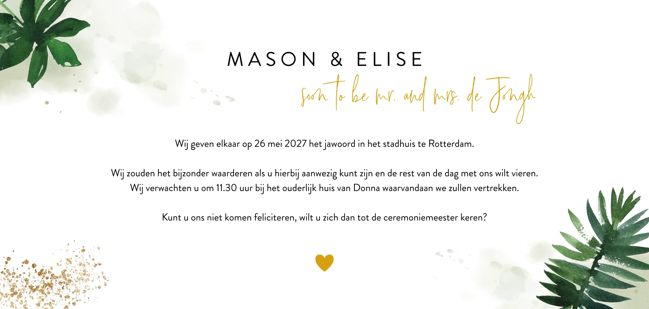 Panorama trouwkaart met eigen foto, tropische bladeren en goudkleurige verfspetters. Hippe, botanische trouwkaart met een originele uitstraling. De groene bladeren geven de kaart een exotische uitstraling, perfect voor bruiloften in de zomer. Op de voorzijde kun je een mooie foto plaatsen. De kaart is versierd met gouden verfspatten en groene waterverf. Met sierlijke en speelse tekst staat voorop 'wij gaan trouwen'.