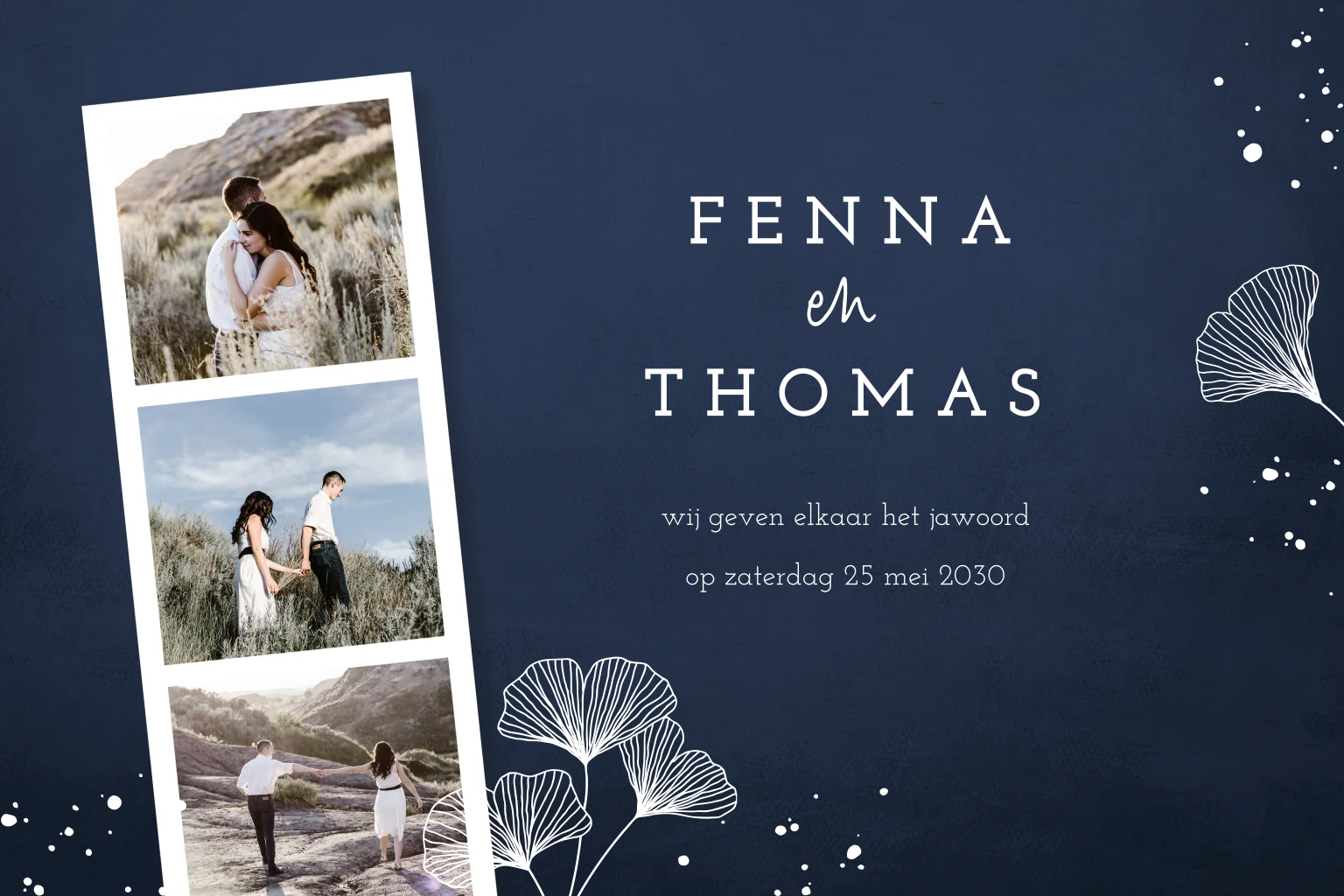 Op zoek naar een mooie trouwkaart? Deze stijlvolle trouwkaart heeft een diepe donkerblauwe achtergrond die prachtig matcht met de koperfolie accenten. Kies voor deze donkerblauwe waterverf trouwkaart met koperfolie ginkgo bladeren en spetters. Op de voorzijde zie je een witte fotostrip met ruimte voor drie foto's. De kaart is verder versierd met Japanse ginkgo bladeren en spetters. Strakke en sierlijke lettertypes wisselen elkaar af. In de kaart is ruimte voor een dagprogramma en alle overige informatie. Kijk bij ook verkrijgbaar voor vergelijkbare ontwerpen.