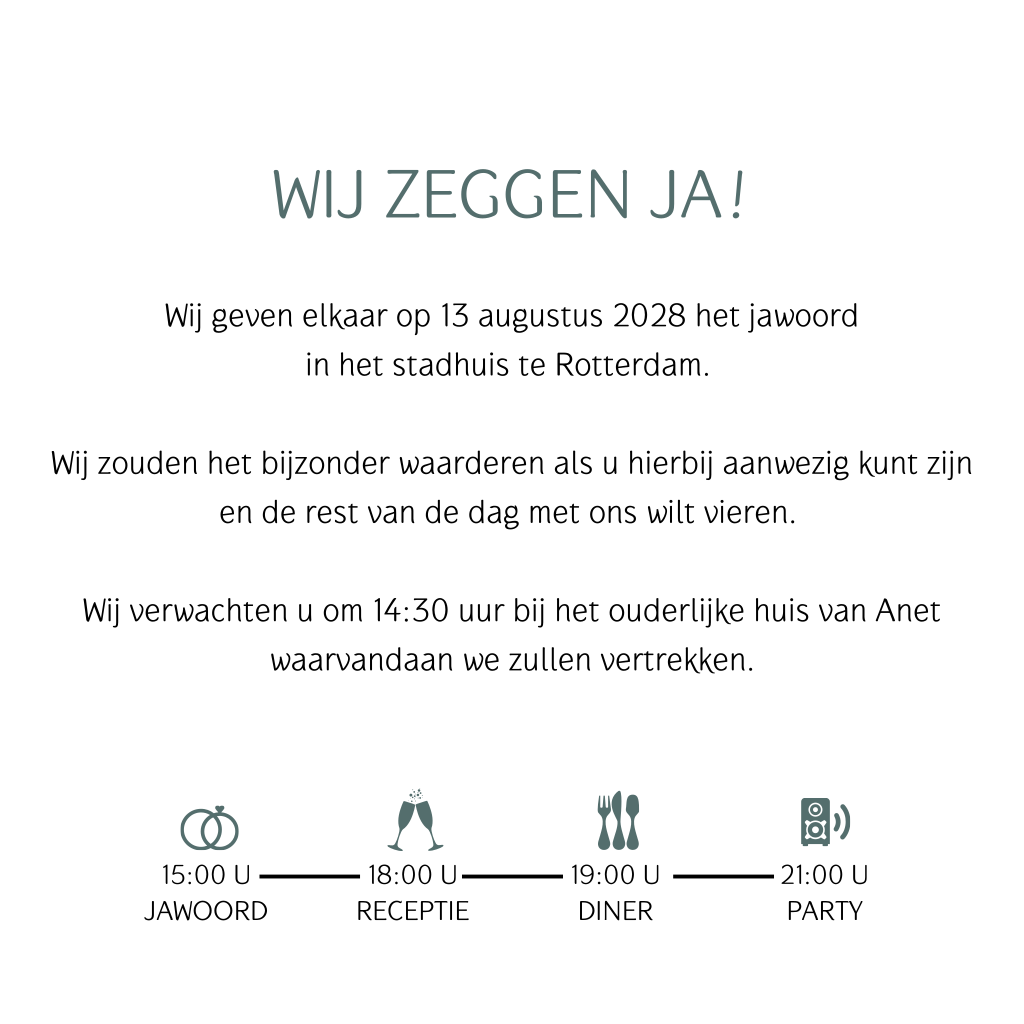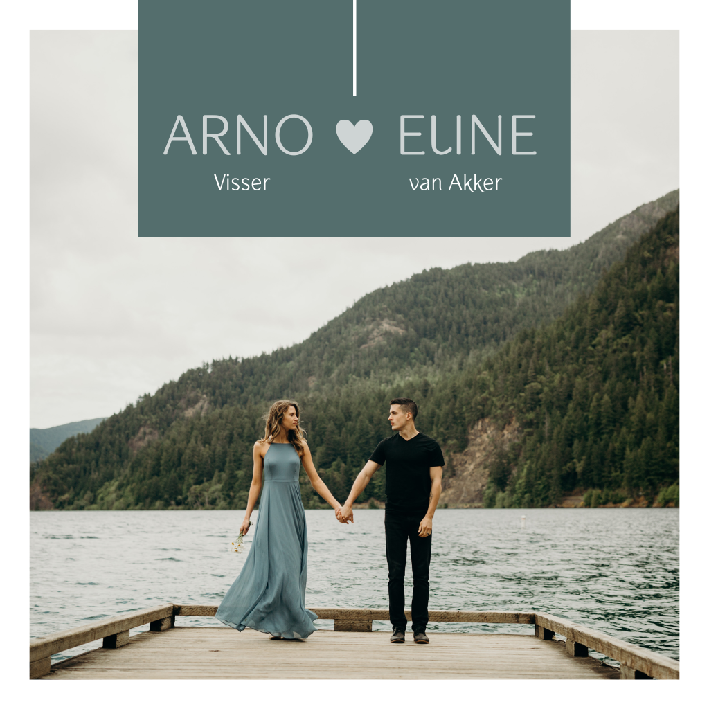 Heb je een mooie fotoshoot laten maken? Plaats dan de mooiste foto groot voorop je trouwkaart. In het vlak boven de foto kun je je namen kwijt. Het vlak kun je een kleur geven die past bij de fot. Heb je hulp nodig bij het bepalen van een mooie kleur? neem dan contact met ons op, we kijken graag even mee.