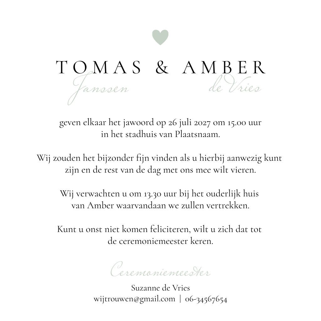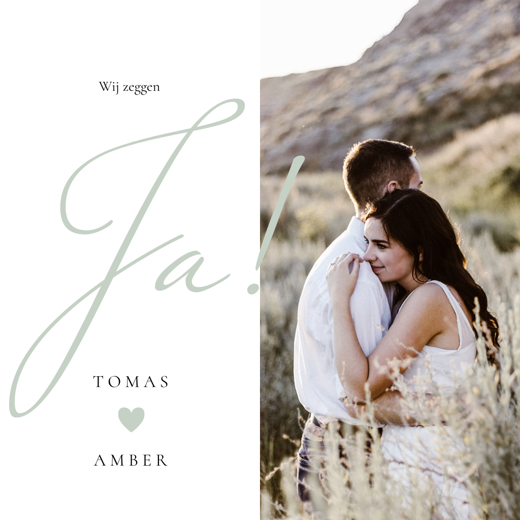 Klassieke trouwkaart met eigen foto en de tekst JA! Ben je zoek naar een mooie trouwkaart om je gasten op jullie huwelijksfeest mee uit te nodigen? Dan is deze vierkante trouwkaart misschien wel iets voor jullie. Op de kaart staat een mooie foto van jullie samen en aan de andere zijde staat: "Wij zeggen JA!" Binnenin kun je het volledige programma kwijt.