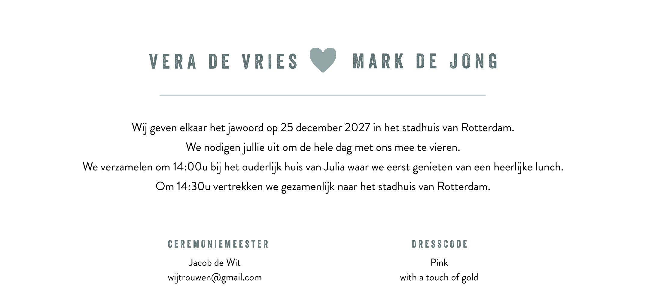 Hebben jullie een loveshoot gehad? Dan is dit een hele mooie trouwkaart voor jullie. Plaats namelijk je mooiste foto voorop de kaart. let er wel op dat je een liggende foto hebt met veel ruimte eromheen. Dan kun je deze perfect op de kaart kwijt. De namen staan aan de zijkanten maar kun je natuurlijk ook op een andere plek kwijt. Pas dit eenvoudig aan met de ontwerptool.