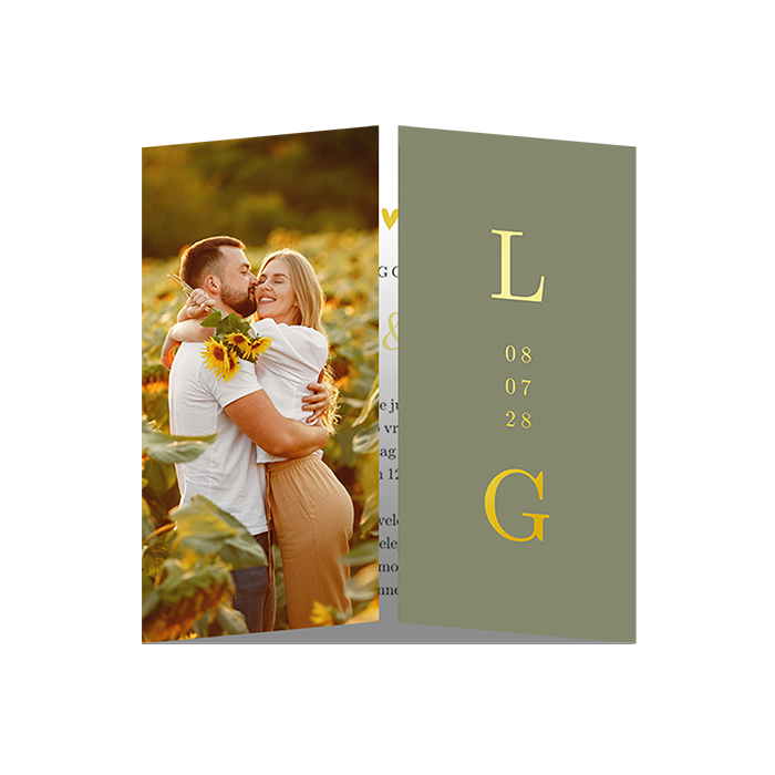 Deze stijlvolle trouwkaart met theatervouw opent vanuit het midden en onthult jullie uitnodiging in het midden. De olijfgroene zijde is voorzien van jullie initialen en trouwdatum in opvallende typografie, gedrukt met goudfolie. De linkerflap (in de tool dus rechts) ruimte biedt voor een stralende foto in zomerse sfeer. Een perfecte kaart voor een bruiloft in de natuur of buitenlucht. Pas in de editor gemakkelijk de kleuren, tekst, initialen en foto aan voor een unieke aankondiging van jullie grote dag.