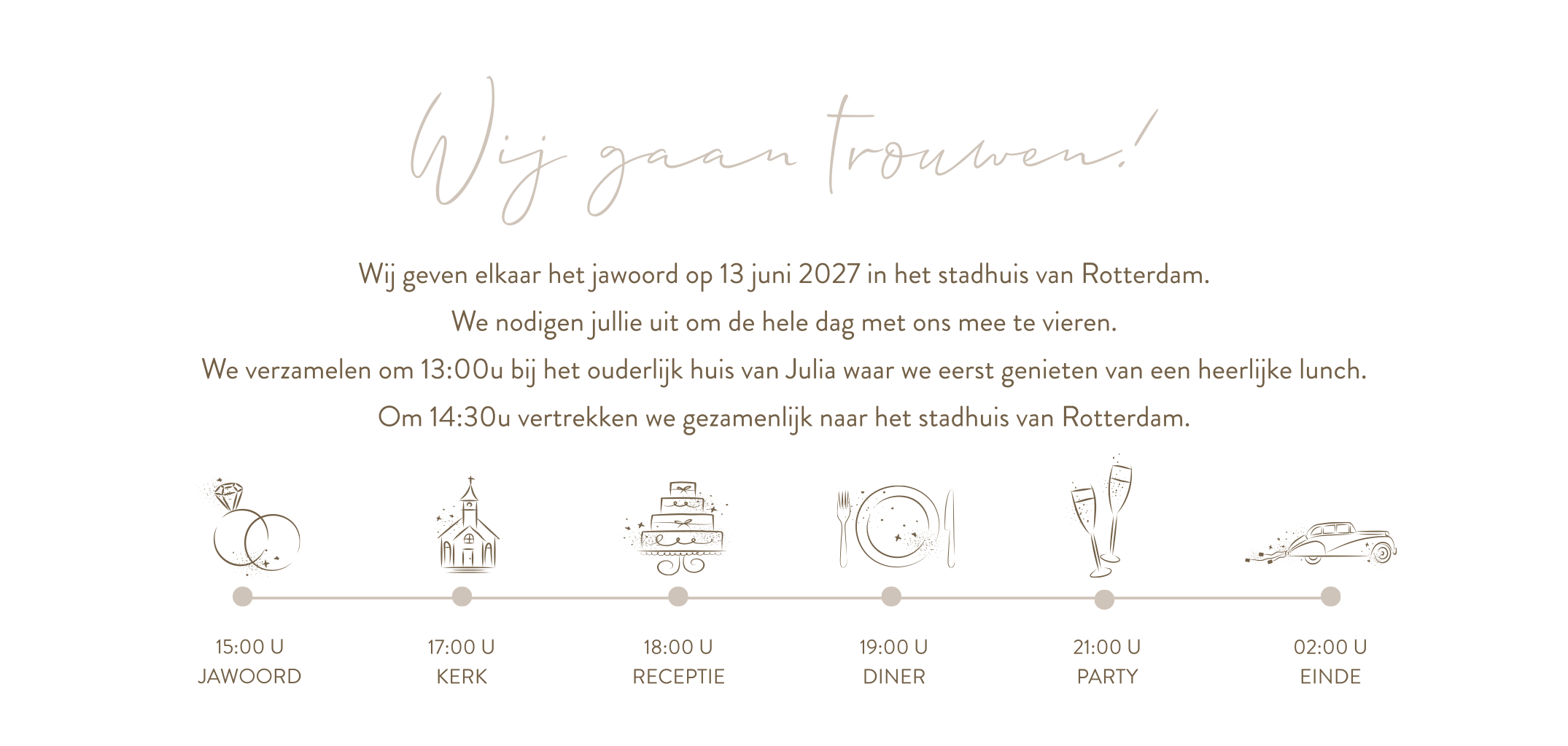 Panorama foto trouwkaart met bloemen en spetters in de kleur taupe. Op zoek naar een stijlvolle trouwkaart met een speelse uitstraling. Dit nieuwe ontwerp is hip en chic tegelijk door het gebruik van de kalme kleur taupe. De achtergrondkleur is net een tintje lichter maar de bloemen hebben de diepe mooie kleur. De goudkleurige spetters maken het ontwerp nog feestelijker. Met een hip lettertype staan jullie namen op de ene zijde van het tweeluik. Op de andere kant kun je een mooie foto van jullie plaatsen.