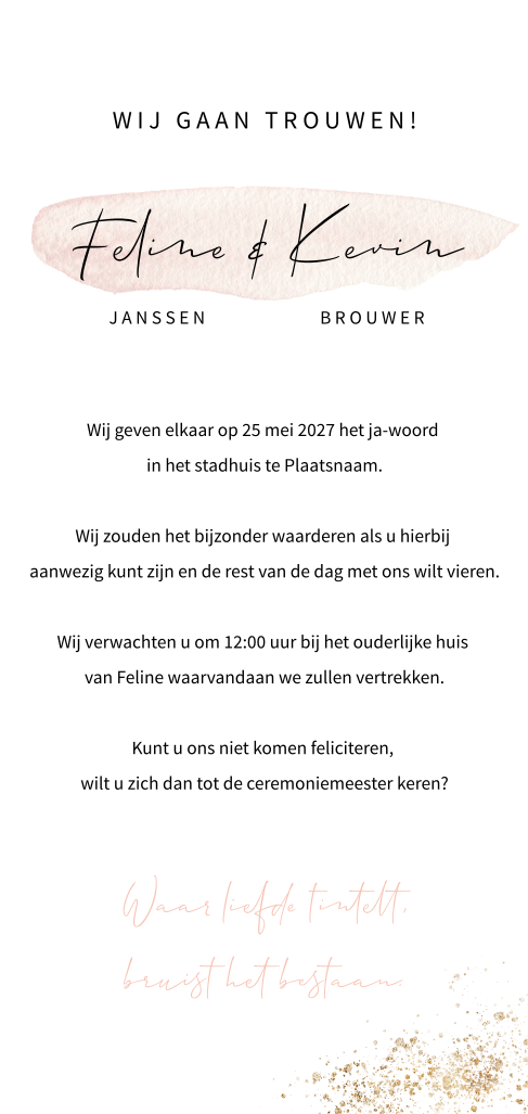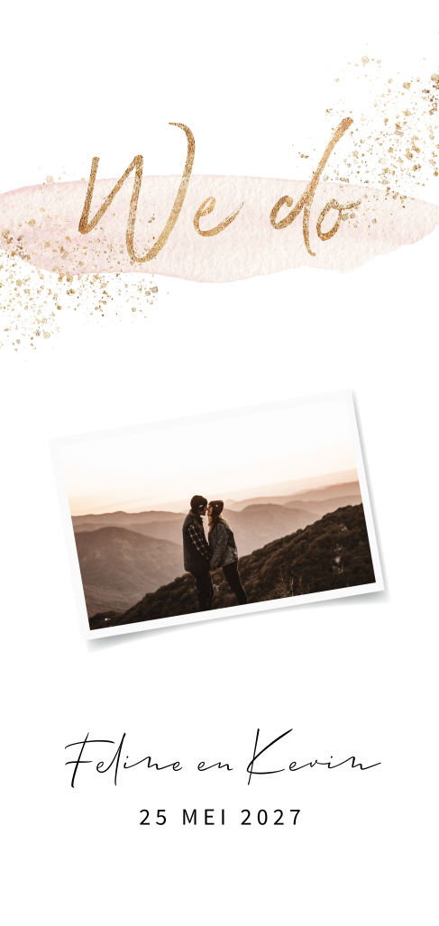 Stijlvolle trouwkaart met blush waterverf, eigen foto en goudkleurige spetters. Witte trouwkaart met elegante uitstraling en moderne typografie. De kaart heeft een grote roze waterverf vlek op de voorzijde en is versierd met witgouden spetters. Met mooie gouden letters staat 'we do' bovenaan de kaart. Aan de binnenzijde is ruimte voor het dagprogramma en een persoonlijk bericht. Benieuwd hoe de kaart er in het echt uitziet? Bestel een proefdruk en bekijk het gedrukte resultaat.