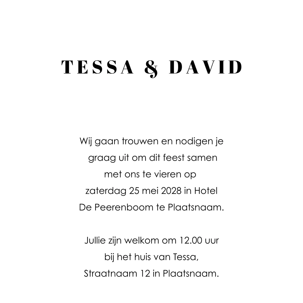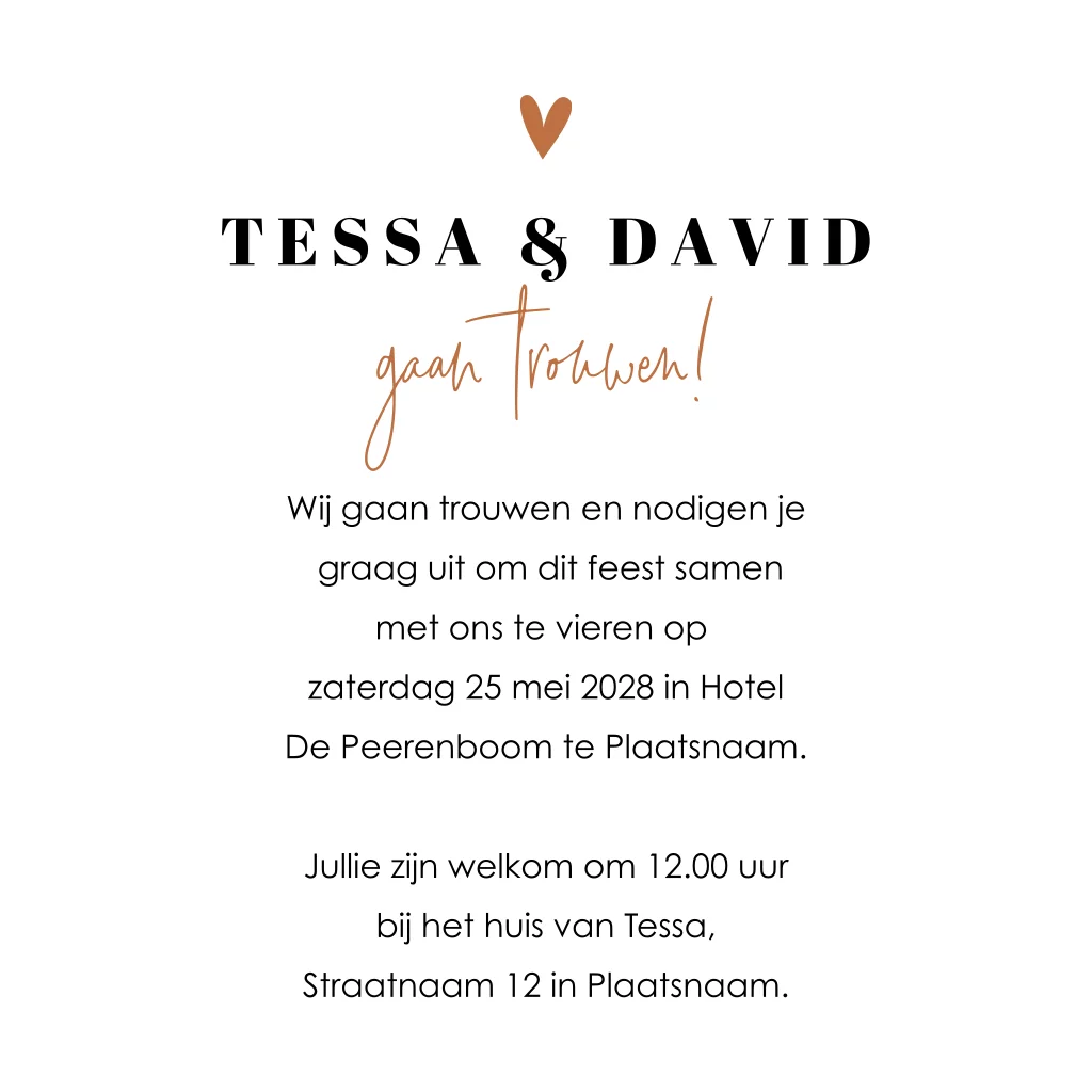 Laat je creativiteit de vrije loop en personaliseer de kaart moeiteloos in de editor om het perfect aan te passen aan jullie stijl en voorkeuren. Om een voorproefje te krijgen van het uiteindelijke resultaat, raden we aan een drukproef te bestellen.