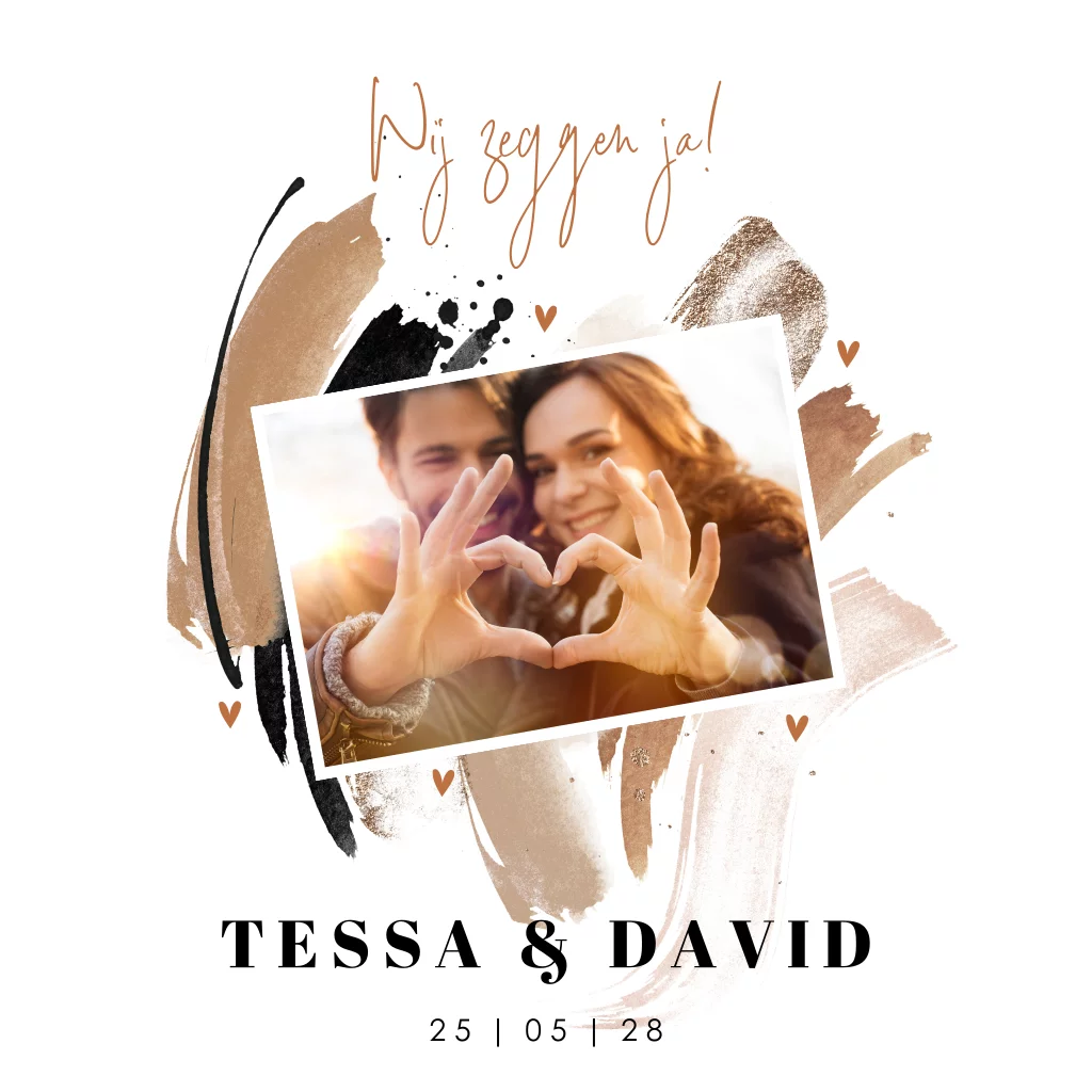 Ontwerp een unieke trouwuitnodiging in een vierkant formaat, verfraaid met artistieke penseelstreken in warme tinten zoals bruin, beige en zwart. Deze compositie wordt aangevuld met een prachtige foto van jullie beiden, elegant omlijst door een wit kader. Een subtiel accent wordt toegevoegd door de aanwezigheid van kleine hartjes die de kaart verfraaien.