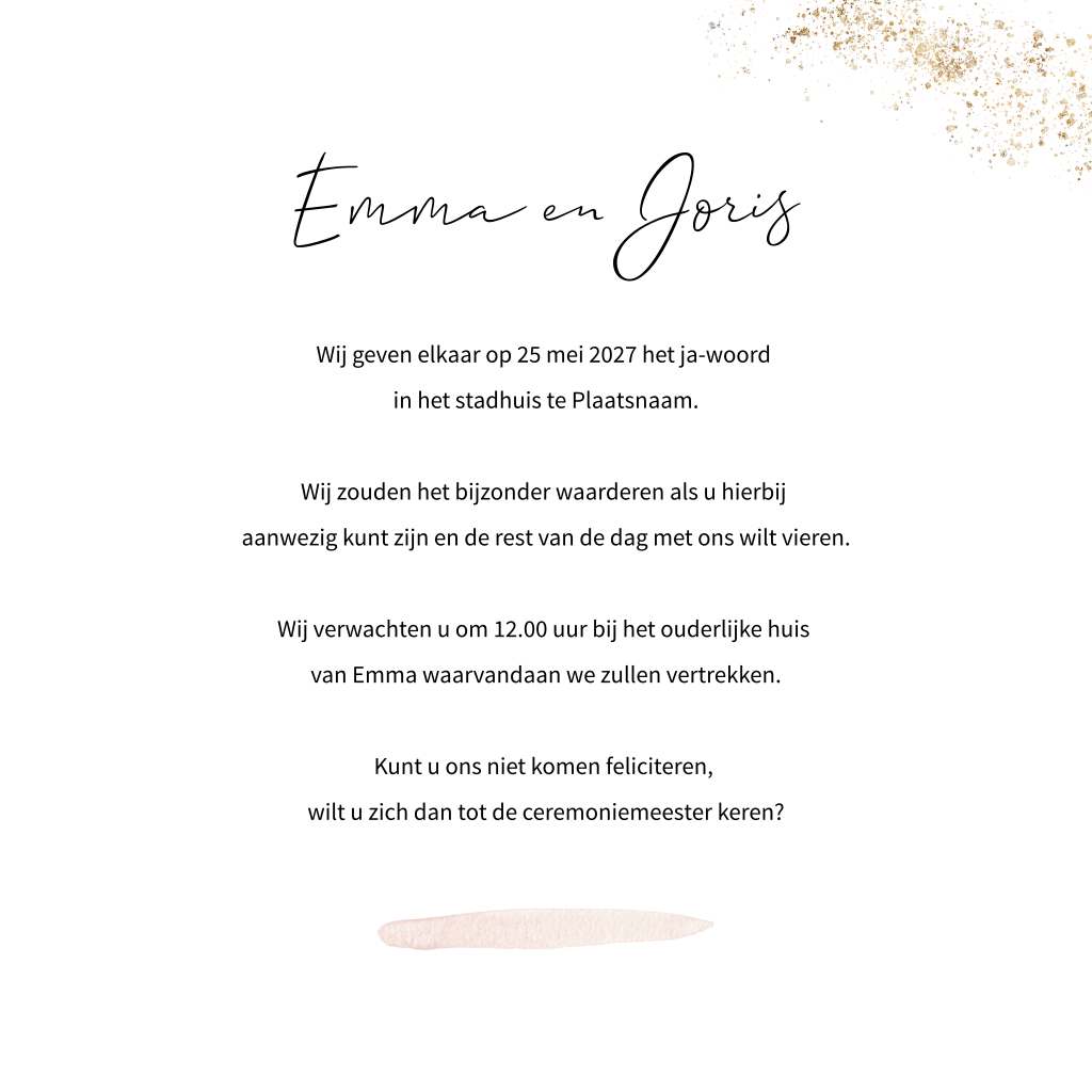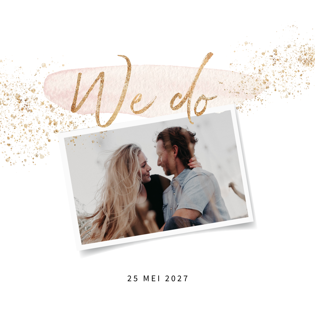 Op zoek naar een chique trouwkaart met een moderne uitstraling? Kies dan voor deze witte kaart met zalmroze waterverf. Op de voorzijde staat met gouden letters de tekst 'we do'. Ook is de kaart gedecoreerd met goudkleurige spikkels. In het witte kader kun je een foto van jullie plaatsen.