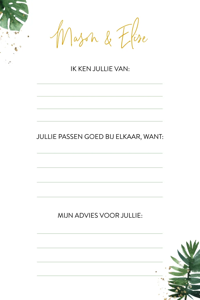 Op zoek naar een vrolijke invulkaart voor jullie bruiloft? Dit botanische invulkaartje met tropische bladeren en gouden spetters is een leuke toevoeging aan elk huwelijksfeest. Laat je gasten een paar vragen invullen over jullie, zo heb je een mooie herinnering voor later.