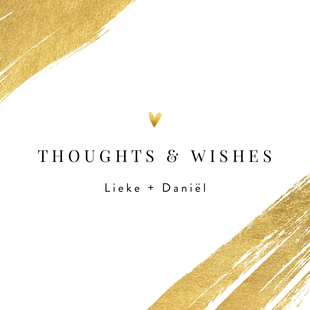 Wil je dat je gasten een berichtje kunnen achterlaten op jullie bruiloft? Ga dan voor deze klassieke invulkaart met gouden verfstreken. Op deze invulkaart kunnen gasten hun advies, wensen en gedachten met jullie delen. Een bak vol met deze ingevulde kaartjes is natuurlijk een mooie herinnering! Er zijn ook bijpassende trouwkaarten, save the date kaarten en meer verkrijgbaar.