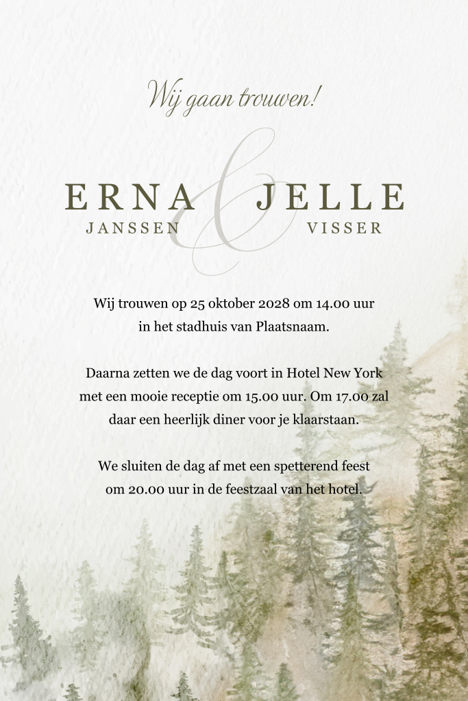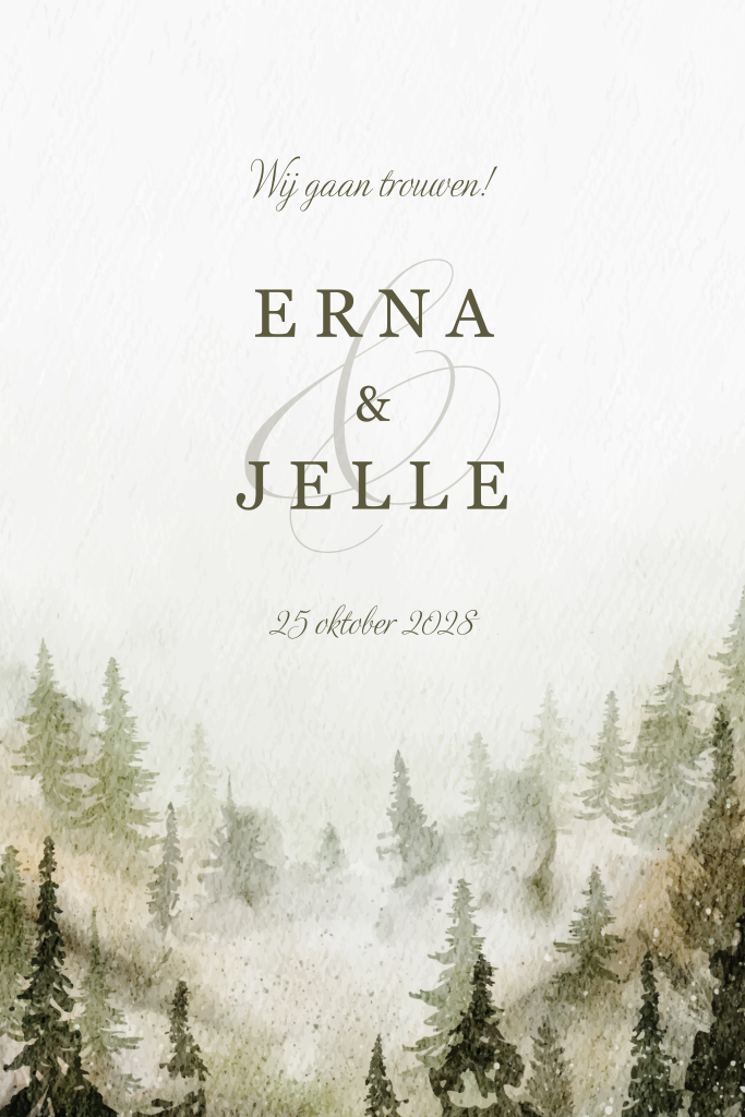 Ontwerp een prachtige trouwkaart met een betoverende waterverf illustratie van een mysterieus dennenbos gehuld in nevel. Deze uitnodiging is perfect voor jullie bruiloft in het najaar. Personaliseer de kaart volledig naar jullie wensen en bestel een drukproef, zodat jullie alvast kunnen genieten van het prachtige eindresultaat.