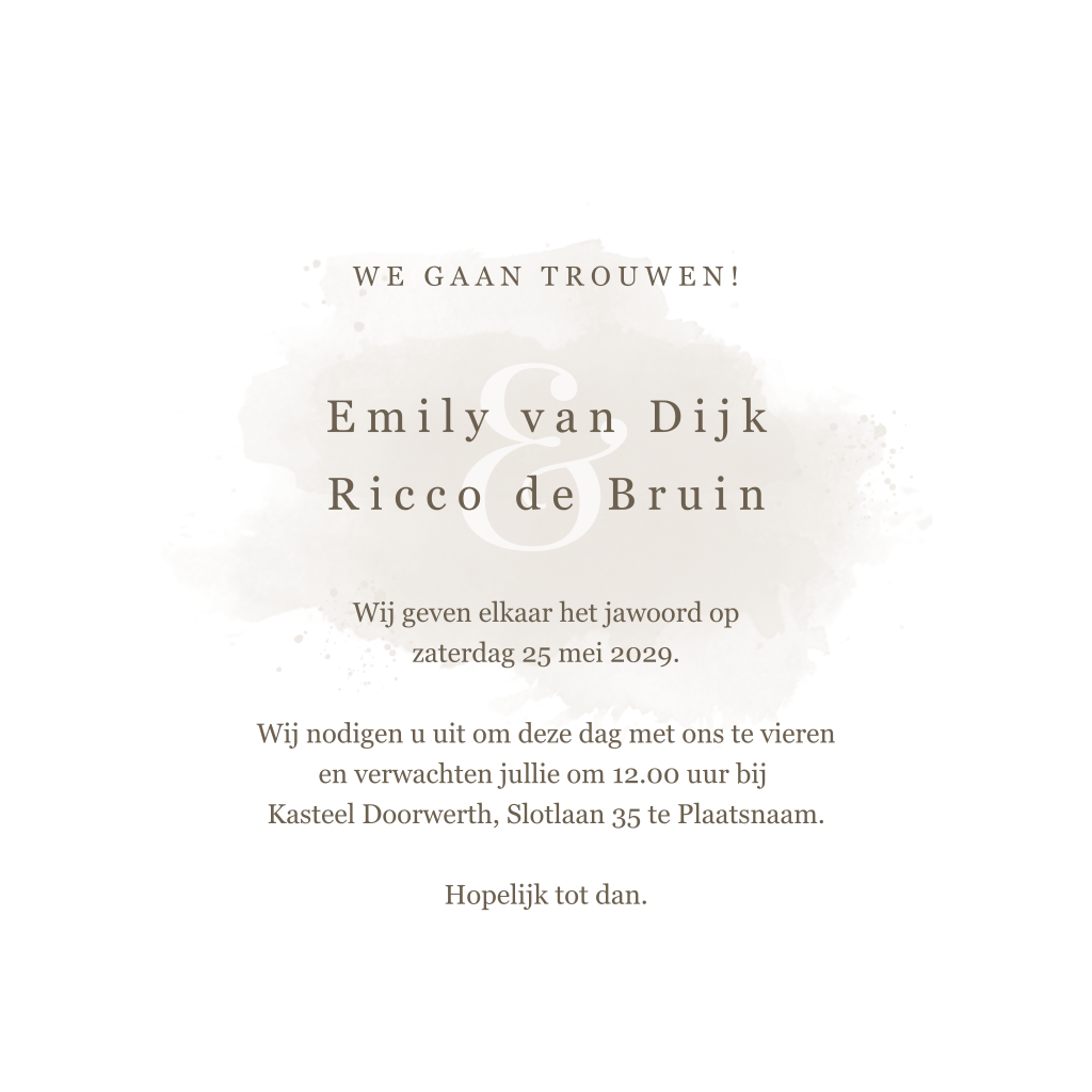 Een prachtige beige trouwkaart wacht op jullie grote trouwdag. Op een achtergrond van zachte beige waterverf pronkt de krachtige tekst "JA" in donkerbruin. Door dit woord staan jullie namen, subtiel geplaatst binnen de vloeiende letters. Een witte waterverfvlek licht het geheel mooi op. Deze kaart belooft niet alleen de viering van liefde, maar omarmt ook de schoonheid van eenvoud op jullie speciale dag.
