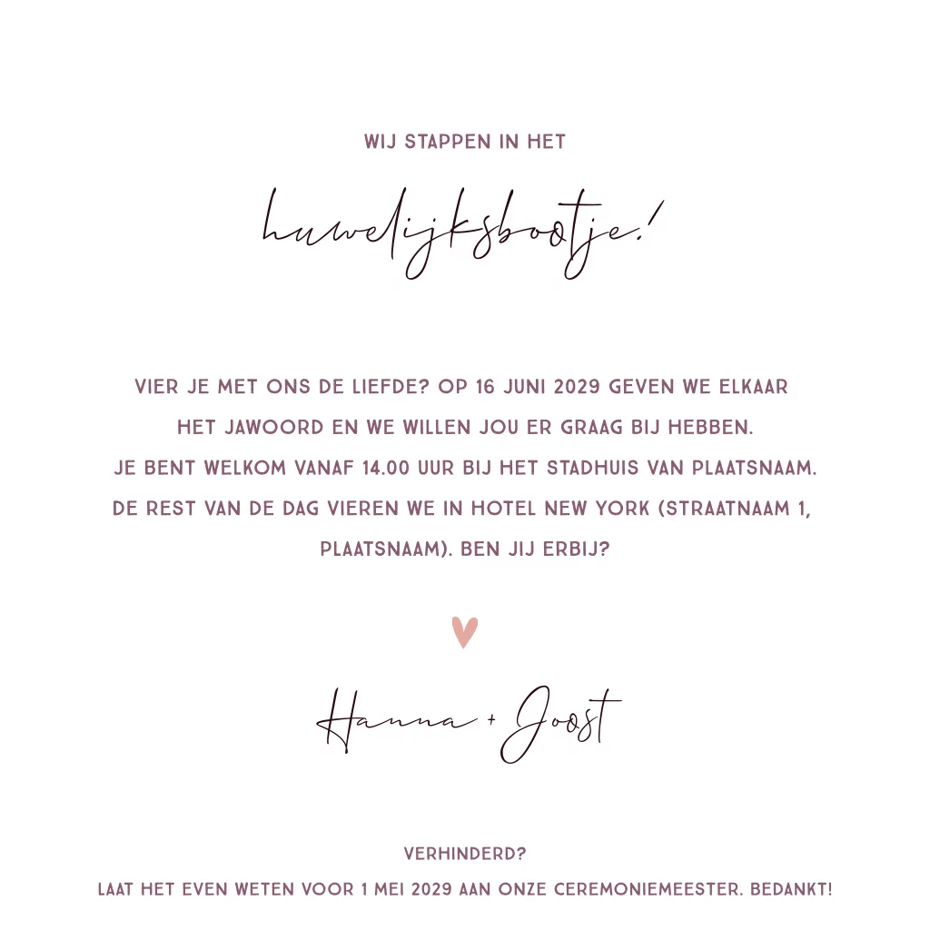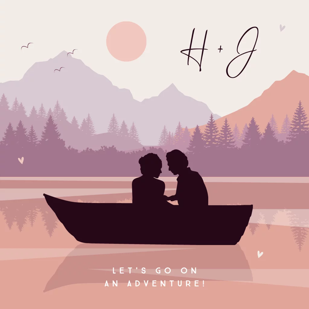 Lila en zalmkleurige trouwkaart met een silhouet van een verliefd stel in een roeibootje op een uitgestrekt meer. Ze varen samen door een landschap met bergen en bomen. Een avontuurlijke trouwkaart in prachtige kleuren! Personaliseer dit ontwerp eenvoudig in onze editor en bestel een proefdruk.