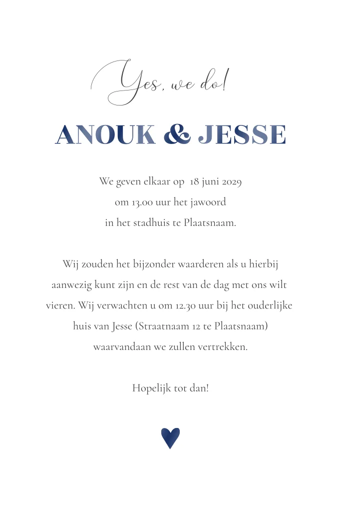 Een hippe trouwkaart met een verfijnde blauwe strik als detail. Jullie initialen staan prominent op de voorkant en stralen door de glanzende afwerking. De kaart heeft een vrolijke uitstraling en straalt een feestelijke sfeer uit. Pas de kaart eenvoudig aan in de kaarteneditor en creëer een uitnodiging die perfect bij jullie dag past.