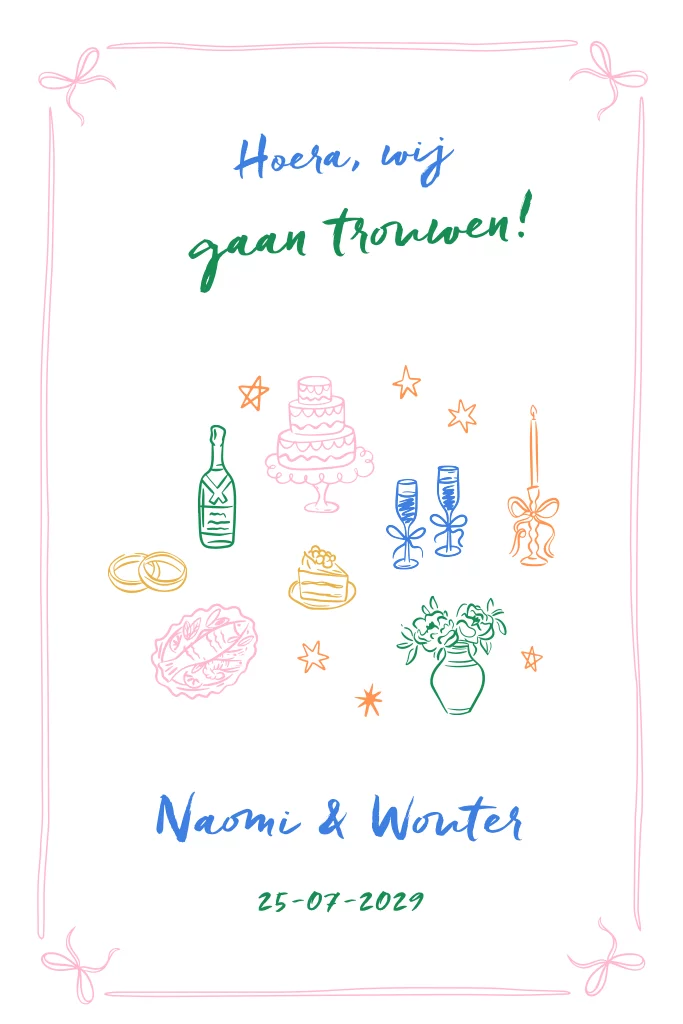 Deze moderne trouwkaart heeft een speels en kleurrijk ontwerp, perfect voor koppels die op zoek zijn naar iets unieks en eigentijds. De kaart heeft afgeronde hoeken en is versierd met handgetekende icoontjes in zachte pastelkleuren, zoals trouwringen, een bruidstaart, champagneglazen, bloemen en een kaars. De vrolijke typografie in blauw en groen geeft de kaart een persoonlijke en frisse uitstraling.