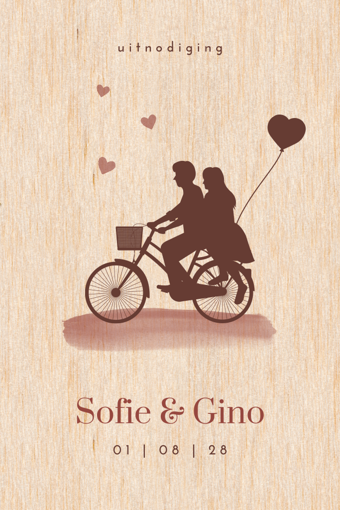 Een prachtige houten trouwuitnodiging met roodbruine silhouetjes op een fiets. Liever andere kleuren? Pas deze trouwkaart zelf aan in onze handige editor.