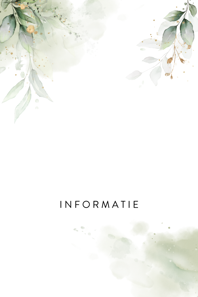 Botanische trouwkaarten zijn hot! Past niet alle informatie op jouw botanische trouwkaart? Dan is dit mooie inlegkaartje de oplossing. Het kaartje is versierd met subtiele bladeren, geschilderd met waterverf en goudkleurige spetters. Pas de lettertypes naar wens aan en je hebt een gepersonaliseerde inlegkaart!