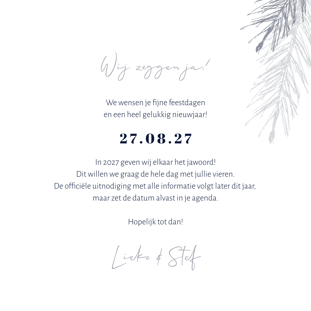 Alvast jullie gasten uitnodigen voor jullie trouwdag en ze meteen een fijne kerst toewensen? Verstuur deze donkerblauwe kerst save the date kaart met takjes, sterretjes en een foto. Plaats een eigen foto in het witte fotokader voor een persoonlijk tintje. Pas eventueel de lettertypes aan in onze handige ontwerptool.