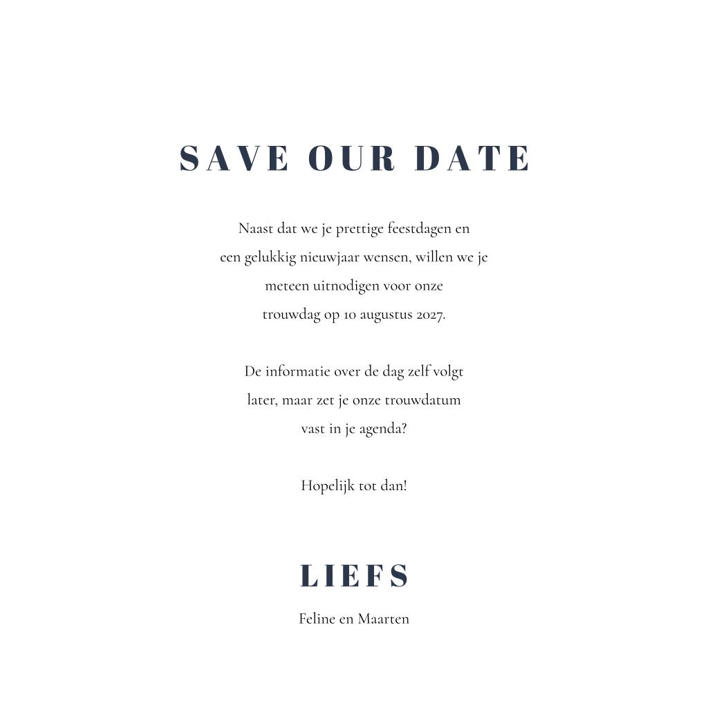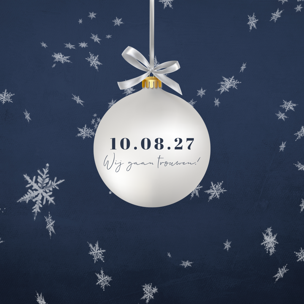 Donkerblauwe kerstkaart met save the date in kerstbal. Kondig jullie bruiloft aan en wens iedereen meteen een fijne kerst en een gelukkig nieuwjaar. Op de voorkant van deze donkerblauwe kerstkaart staat een witte kerstbal met daarop jullie trouwdatum. De sneeuwvlokken op de achtergrond geven een winters tintje.