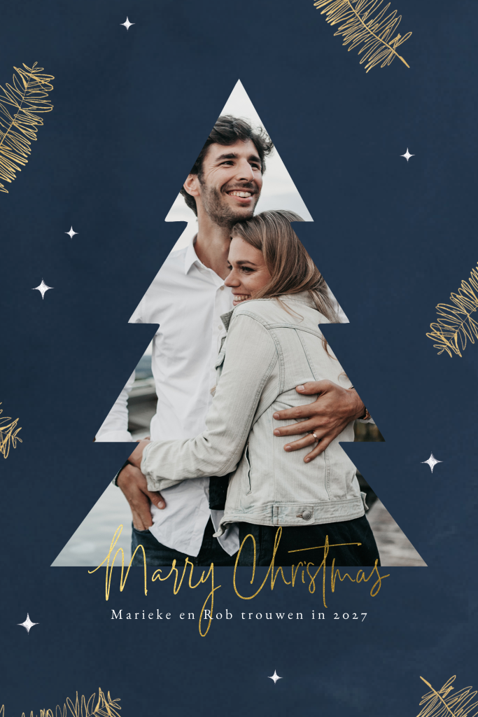 Blauwe Marry Christmas kaart met foto en gouden takjes. Op deze leuke kerstkaart kun je met behulp van onze ontwerptool je eigen foto plaatsen. Nodig iedereen uit voor jullie bruiloft in het nieuwe jaar en wens ze meteen prettige feestdagen toe met deze mooie, donkerblauwe kaart. De goudkleurige takjes, witte sterretjes en sierlijke typografie geven een feestelijk en chique tintje aan deze originele kerstkaart.