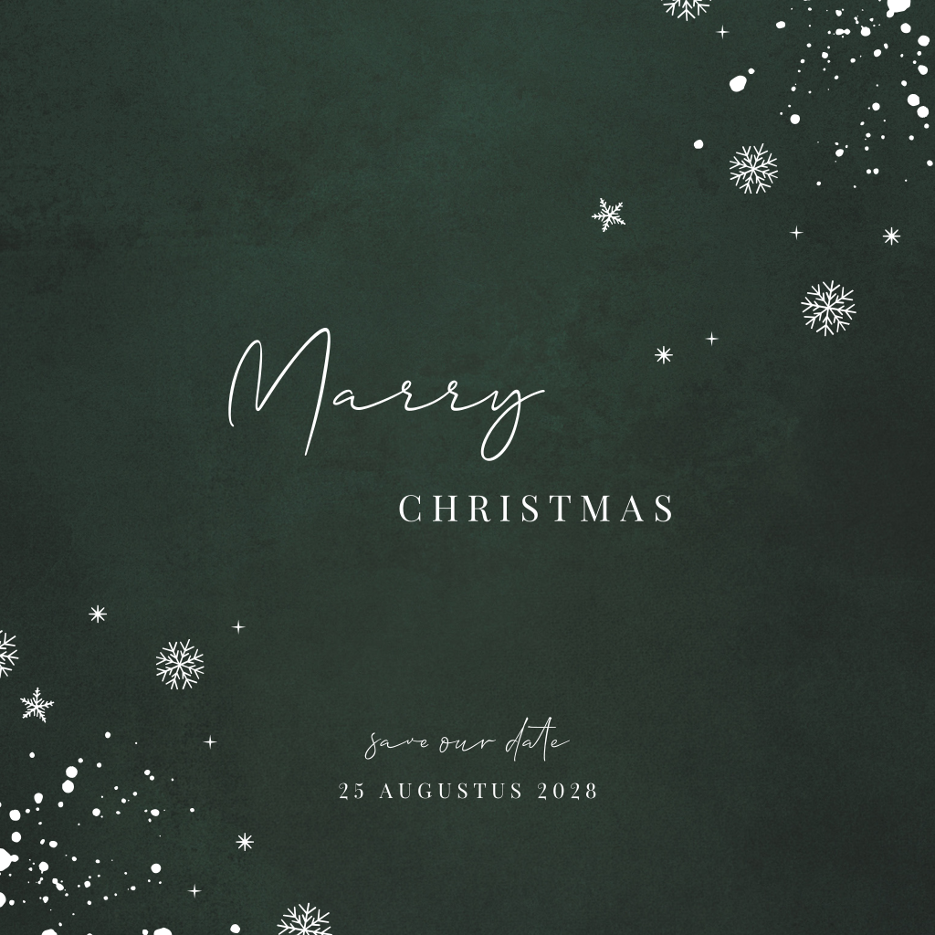 Kerst save the date kaart met donkergroene waterverf en sneeuwsterren. De teksten zijn met goudfolie gedrukt. Gaan jullie in het nieuwe jaar trouwen? Verstuur deze mooie kerstkaart met save the date. Zo ontvangen jouw genodigden een mooie kerstkaart en weten ze direct welke datum ze vrij moeten houden. Dit ontwerp heeft een donkergroene achtergrond, geschilderd met waterverf en is versierd met witte spetters in de hoeken. De sneeuwsterren maken de save the date helemaal af.