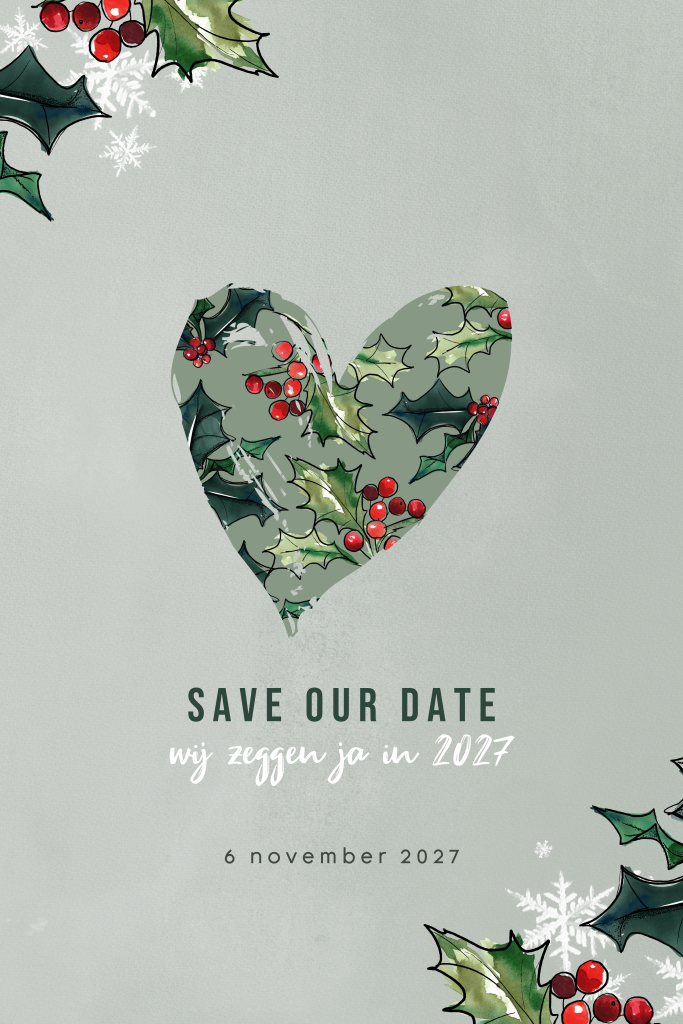 Save the date kerstkaart met groen hart, hulst en sneeuwvlokjes. Een winterse kaart om niet alleen je naasten een fijne kerst toe te wensen, maar ze ook jullie trouwdatum te laten noteren in hun agenda. Aan de binnenkant van deze dubbele kaart komen de illustraties van hulst terug. Ook kun je er je eigen kerstgroet en info over je bruiloft kwijt.