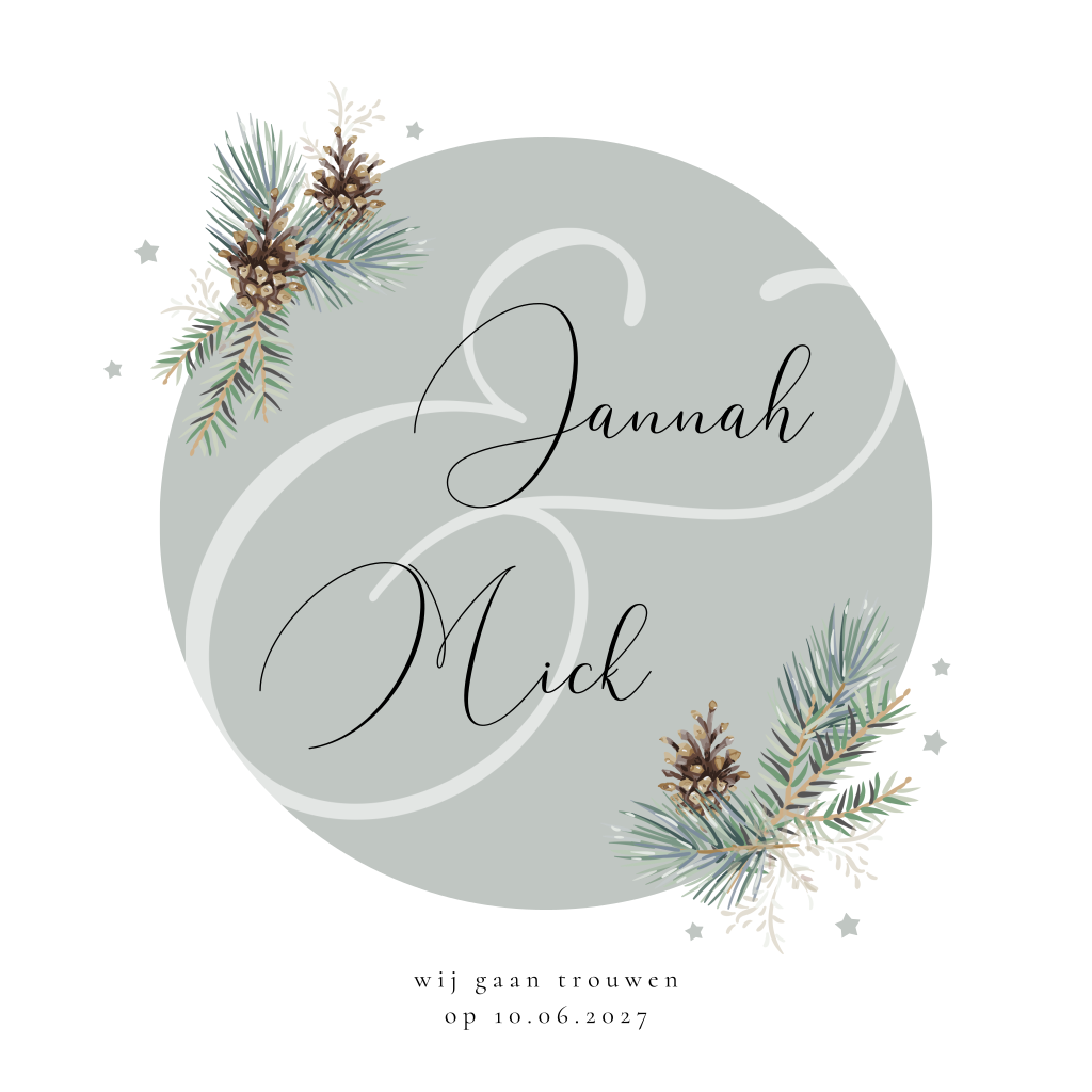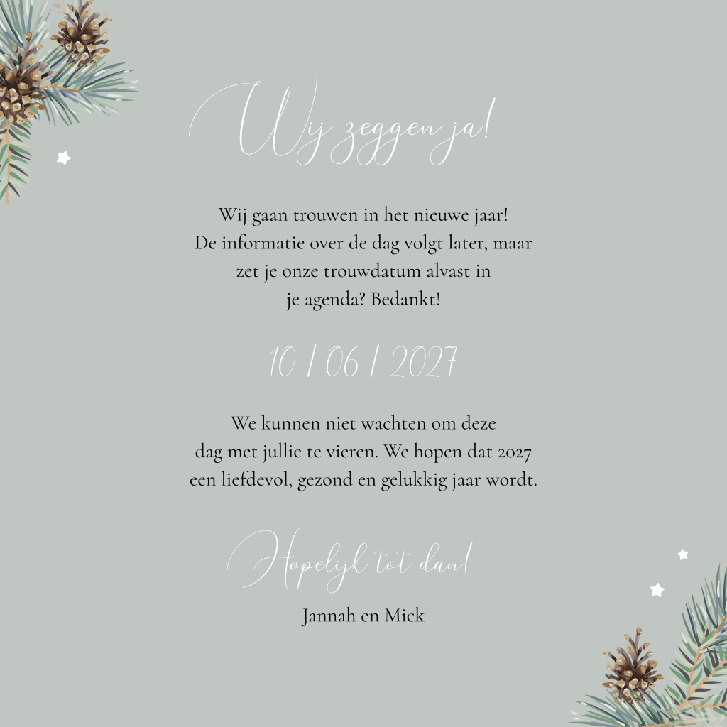 Kerstkaart trouwen in zachtgroen met dennenappels en sterretjes. Wanneer jullie in het nieuwe jaar gaan trouwen en dit alvast willen aankondigen, dan kun je dit met een mooie kerstkaart doen! Kies bijvoorbeeld dit zachtgroene ontwerp met dennenappels, takjes en kleine sterretjes. De sierlijke typografie geeft deze kaart een chique uitstraling. De binnenzijde van de kaart heeft een groene achtergrond en genoeg ruimte voor een kerstgroet en informatie over jullie aankomende trouwdag.