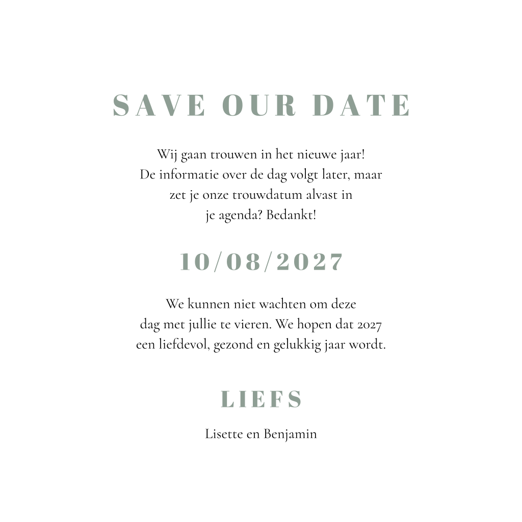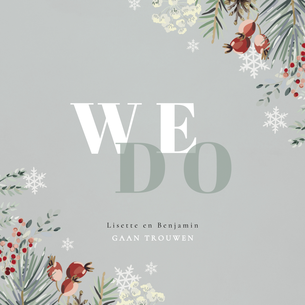 Zachtgroene kerstkaart We Do met dennentakjes en sneeuwvlokken. Gaan jullie volgend jaar trouwen en willen jullie dit alvast aankondigen tijdens de kerst? Verstuur deze save the date kaart met kerstthema! Op de voorkant staat in opvallende letters 'We Do', met daaromheen getekende dennentakjes, besjes en sneeuwvlokken. Aan de binnenzijde is ruimte voor een kerstgroet en een stukje tekst over jullie aankomende trouwdag.