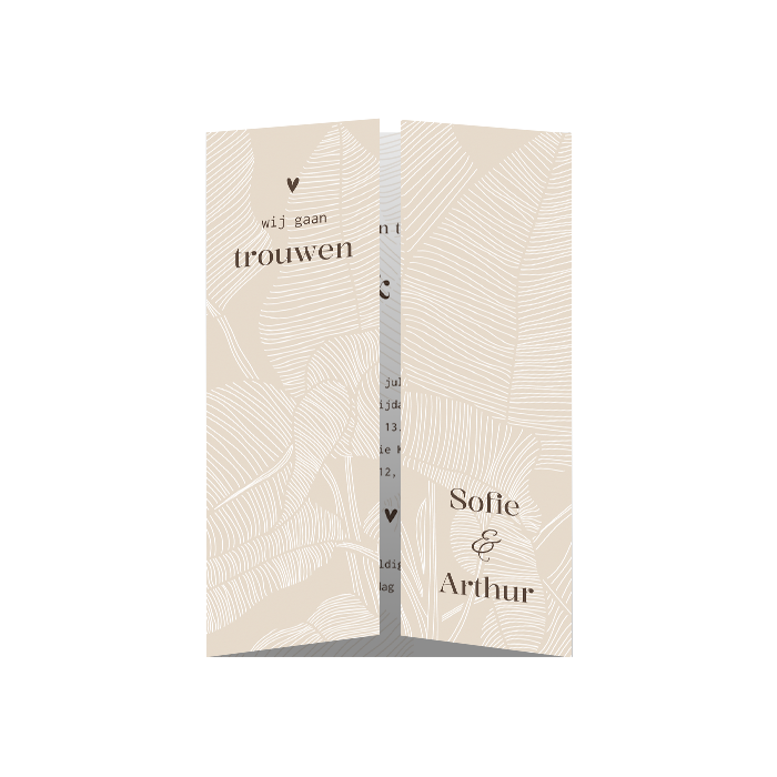 Een chique trouwuitnodiging voor je bruiloft met theatervouw. Deze originele trouwkaart heeft op de voorkant een beige patroon van bladeren. Pas deze uitnodiging naar eigen wens aan in de editor en maak het helemaal in stijl af met de zand envelopkleur.