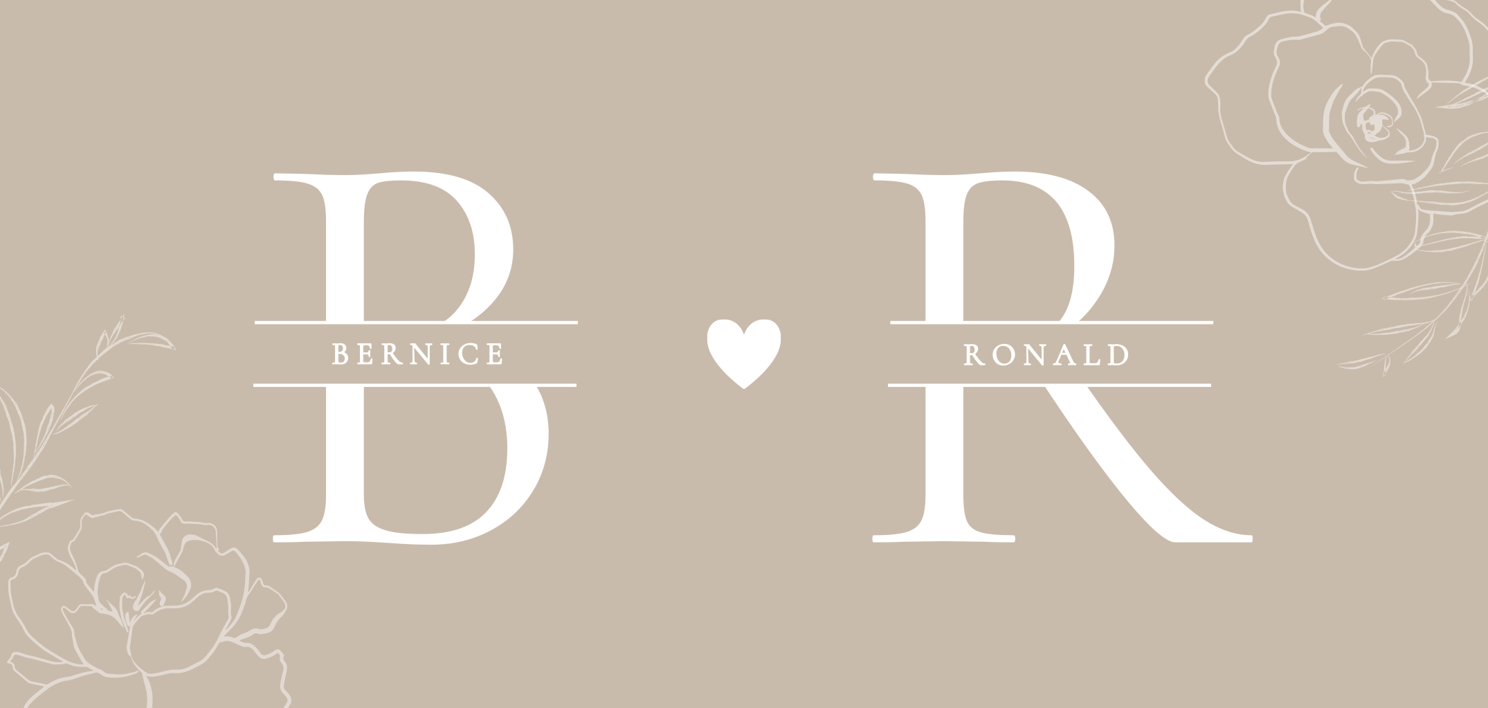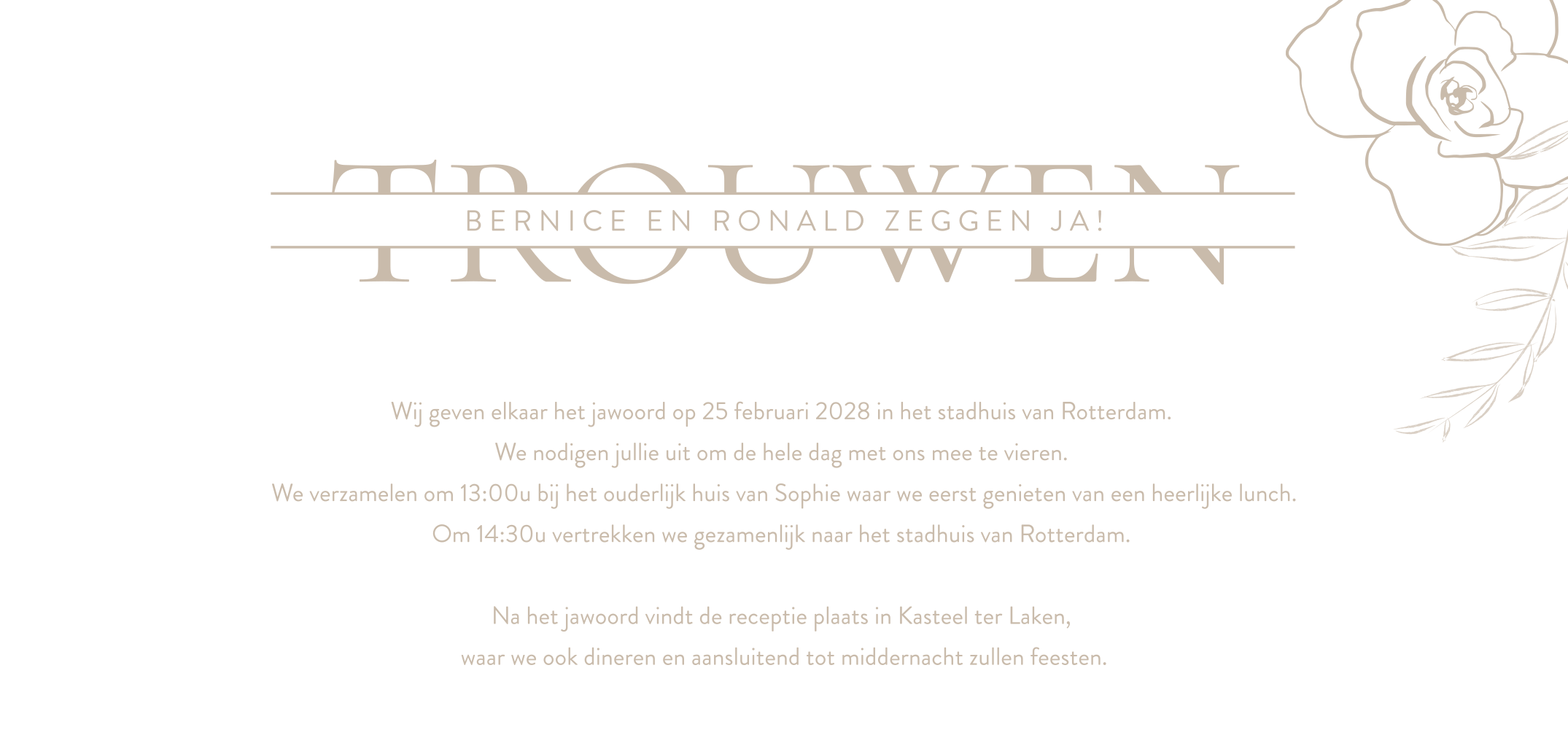 Een panorama trouwkaart in beige met grote, stijlvolle letters waarin jullie initialen in wit pronken. Witte bloemen en takjes sieren de hoeken van de kaart. Pas de kaart aan naar jullie smaak met onze ontwerptool en bestel een proefdruk.