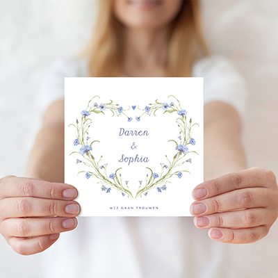 Trouwkaart met blauwe bloemetjes in hartvorm