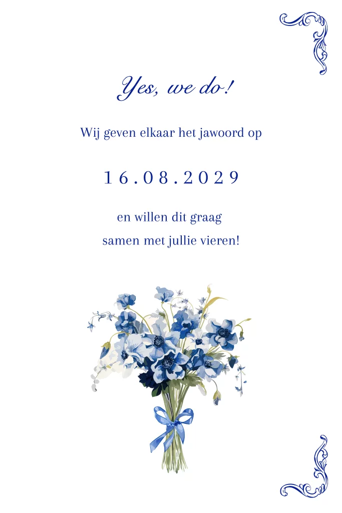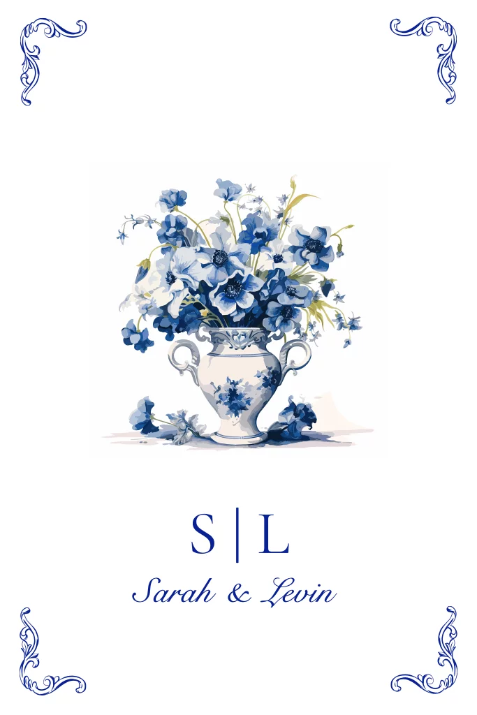 Betover je gasten met een klassieke trouwkaart met een prachtige Victoriaanse vaas – een must-have voor fans van de serie Bridgerton! Deze elegante kaart straalt de romantiek en weelde uit van de Regency-periode en nodigt uit tot een feest in dezelfde stijl. Pas de kaart eenvoudig aan met onze editor en bestel een drukproef om het eindresultaat te zien.