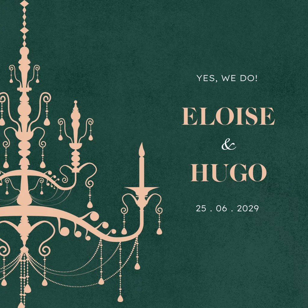 Klassieke donkergroene trouwkaart met roze kroonluchter