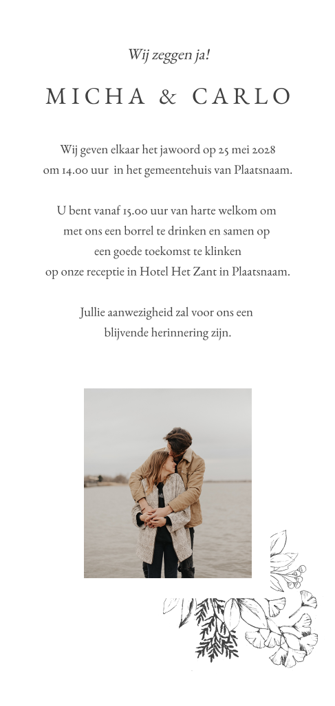 Deze klassieke trouwkaart is perfect om jullie huwelijk mee aan te kondigen. Op de voorzijde zie een &-teken versierd met geïllustreerde bloemen. De bloemen komen terug aan de binnenkant, waar voldoende ruimte is voor alle informatie over jullie speciale dag. Je kan de kleuren en typografie naar wens aanpassen om jullie kaart echt eigen te maken. Is het ontwerp naar wens? Bestel dan een proefdruk, zodat je deze in het echt kan bekijken.