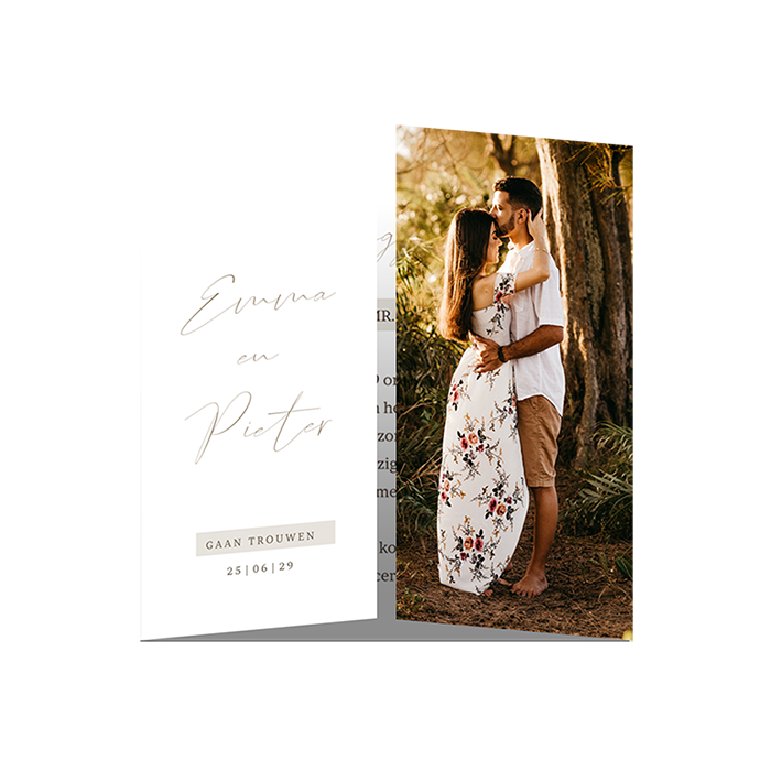 Deze stijlvolle trouwkaart met middenvouw laat jullie liefde stralen. Op de voorkant staan jullie namen in sierlijk schrift, met een romantische foto aan de rechterzijde. De kaart opent vanuit het midden naar twee zijden, wat zorgt voor een verrassingseffect. Perfect voor een persoonlijke en warme uitnodiging.