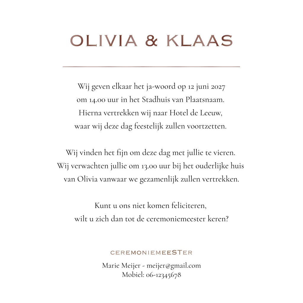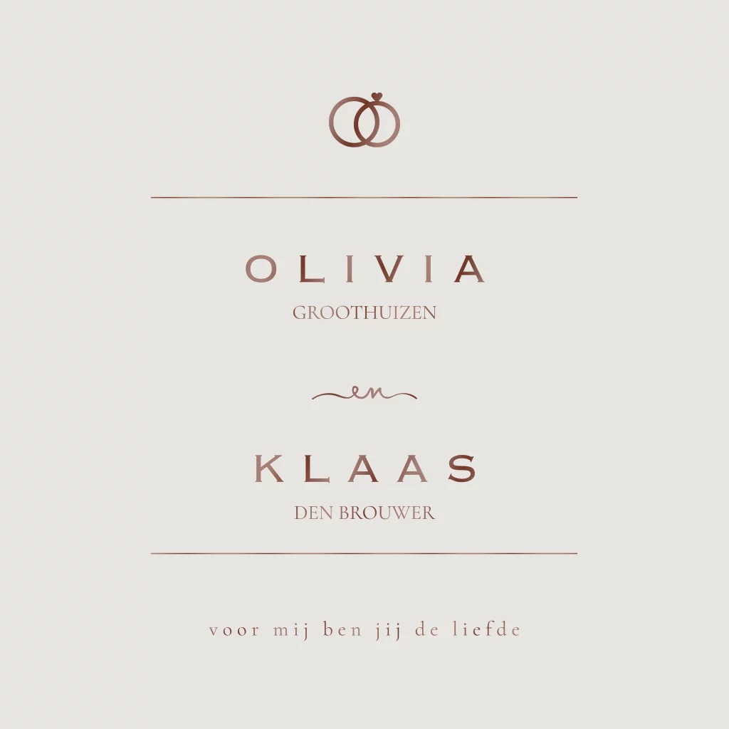 Klassieke trouwkaart met chique typografie en trouwringen in hoogglans bruin/rood. Chique trouwkaart met grijzige achtergrond en stijlvolle uitstraling. Jullie namen staan met mooie letters groot in het midden. Niet helemaal tevreden? In de ontwerptool kun je de teksten, typografie en kleuren aanpassen. Zo maak je de trouwkaart nog persoonlijker.