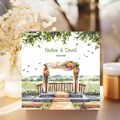 Sfeervolle trouwkaart met waterverf trouwlocatie. Aan de voor- en binnenzijde van deze dubbele kaart staan aquarel illustraties van een idyllische buitenplek om elkaar het jawoord te geven, ideaal voor een romantische ceremonie. Pas deze trouwkaart zelf aan in onze ontwerptool.