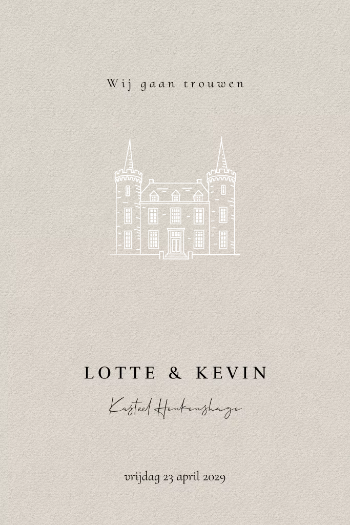 Deze stijlvolle trouwkaart is voorzien van een gedetailleerde lijntekening van Kasteel Henkenshage, subtiel gedrukt in luxe goudfolie. Een elegante en persoonlijke manier om jullie trouwlocatie in de spotlight te zetten. Je kunt de kaart eenvoudig zelf bewerken met onze online editor en desgewenst een proefdruk aanvragen om de kwaliteit van de kaart vooraf te bekijken.