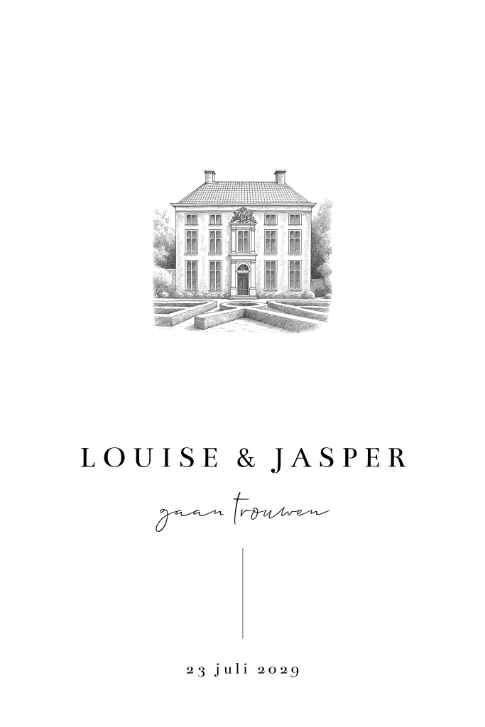 Vier de liefde met een persoonlijke en elegante trouwkaart! Deze stijlvolle kaart bevat een verfijnde zwart-wit illustratie van jullie trouwlocatie: Landgoed De Havixhorst in Drenthe. De klassieke uitstraling van het pand komt prachtig tot zijn recht in deze handgetekende lijntekening, die direct sfeer en karakter toevoegt aan jullie huwelijksaankondiging.