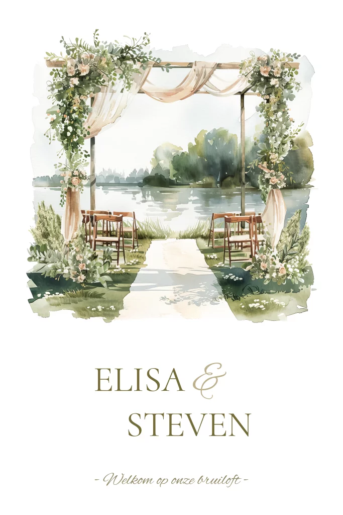 Trouwkaart met een zomerse, romantische sfeer en is perfect voor een bruiloft aan het water. De voorkant toont een in aquarel geschilderde houten boog, versierd met groen en bloemen in zachte tinten. Lichte, golvende doeken hangen sierlijk over de boog, terwijl het meer en omliggend groen een rustige achtergrond vormen. De perfecte plek voor het jawoord. Binnenin bevat de kaart een overzichtelijke tijdlijn met waterverfillustraties. Deze kun je naar wens aanpassen.